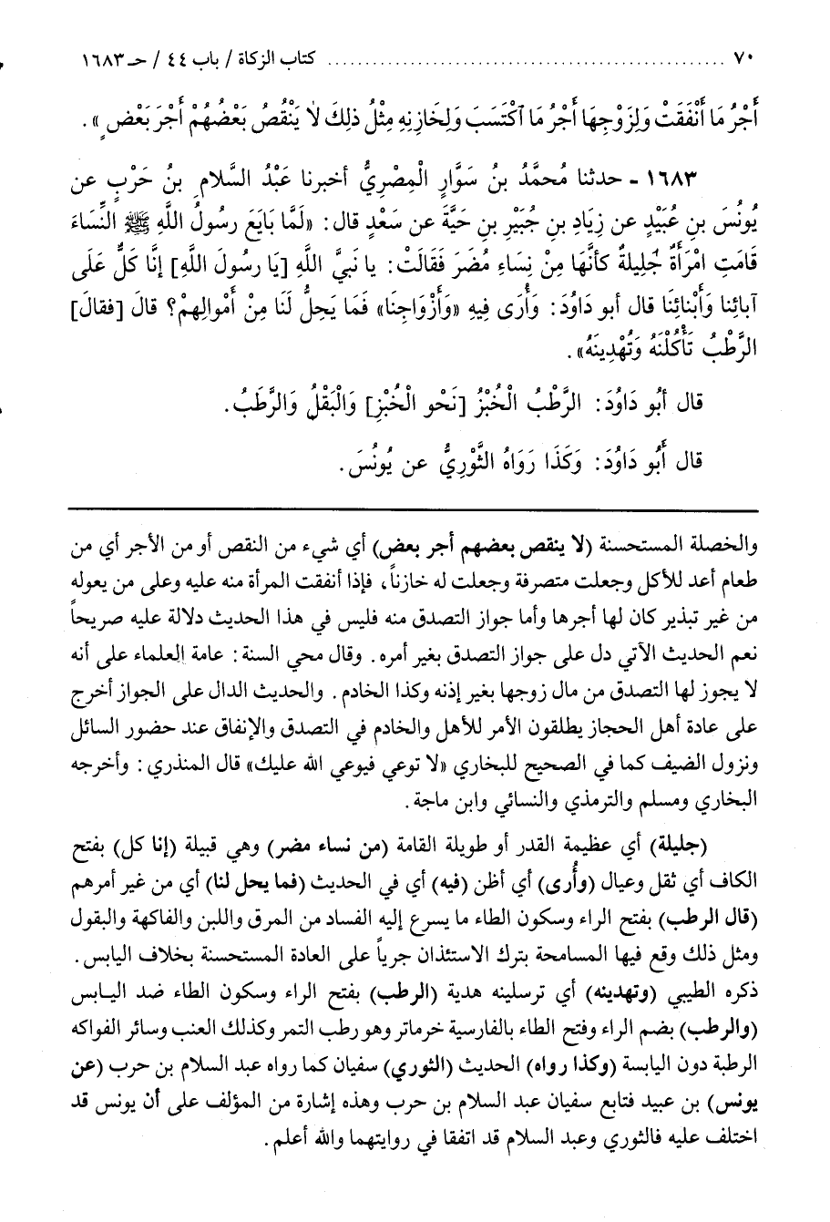 وَالْخَصْلَةِ الْمُسْتَحْسَنَةِ (لَا يَنْقُصُ بَعْضُهُمْ أَجْرَ بَعْضٍ) أَيَّ شَيْئًا مِنَ النَّقْصِ أَوْ مِنَ الْأَجْرِ أَيْ مِنْ طَعَامٍ أُعِدَّ لِلْأَكْلِ وَجُعِلَتْ مُتَصَرِّفَةً وَجُعِلَتْ لَهُ خَازِنًا فَإِذَا أَنْفَقَتِ الْمَرْأَةُ مِنْهُ عَلَيْهِ وَعَلَى مَنْ يَعُولُهُ مِنْ غَيْرِ تَبْذِيرٍ كَانَ لَهَا أَجْرُهَا وَأَمَّا جَوَازُ التَّصَدُّقِ مِنْهُ فَلَيْسَ فِي هَذَا الْحَدِيثِ دَلَالَةٌ عَلَيْهِ صَرِيحًا نَعَمِ الْحَدِيثُ الْآتِي دَلَّ عَلَى جَوَازِ التَّصَدُّقِ بِغَيْرِ أَمْرِهِ
