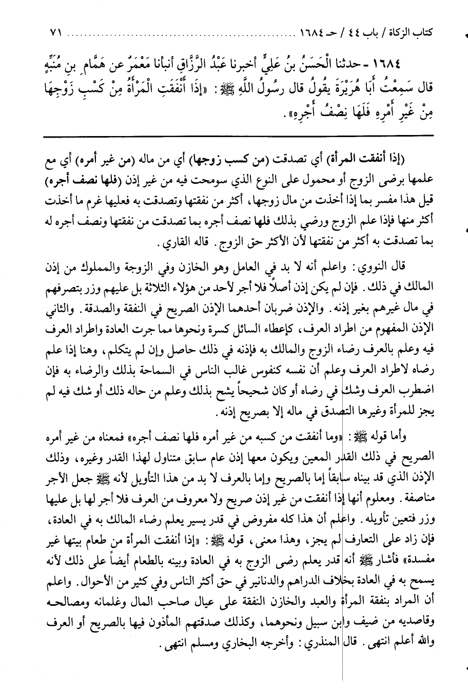 [1687] (إِذَا أَنْفَقَتِ الْمَرْأَةُ) أَيْ تَصَدَّقَتْ (مِنْ كَسْبِ زَوْجِهَا) أَيْ مِنْ مَالِهِ (مِنْ غَيْرِ أَمْرِهِ) أي مع علمها برضى الزَّوْجِ أَوْ مَحْمُولٌ عَلَى النَّوْعِ الَّذِي سُومِحَتْ فِيهِ مِنْ غَيْرِ إِذْنٍ (فَلَهَا نِصْفُ أَجْرِهِ) قِيلَ هَذَا مُفَسَّرٌ بِمَا إِذَا أَخَذَتْ مِنْ مَالِ زَوْجِهَا أَكْثَرَ مِنْ نَفَقَتِهَا وَتَصَدَّقَتْ بِهِ فَعَلَيْهَا غُرْمُ مَا أَخَذَتْ أَكْثَرَ مِنْهَا فَإِذَا عَلِمَ الزَّوْجُ وَرَضِيَ بِذَلِكَ فَلَهَا نِصْفُ أَجْرِهِ بِمَا تَصَدَّقَتْ مِنْ نَفَقَتِهَا وَنِصْفُ أَجْرِهِ لَهُ بِمَا تَصَدَّقَتْ بِهِ أَكْثَرَ مِنْ نَفَقَتِهَا لِأَنَّ الأكثر حق الزوج