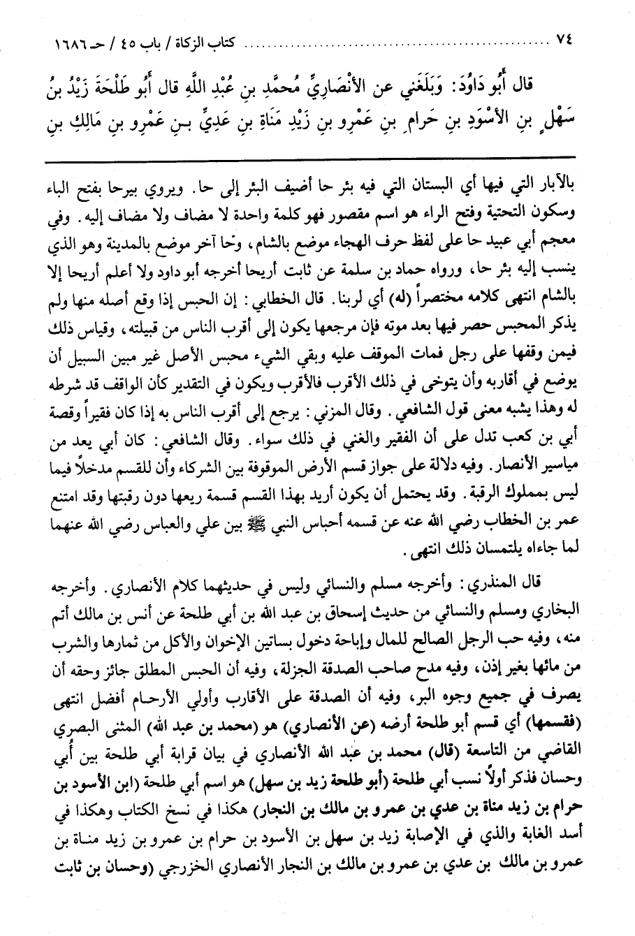 وَأَخْرَجَهُ الْبُخَارِيُّ وَمُسْلِمٌ وَالنَّسَائِيُّ مِنْ حَدِيثِ إِسْحَاقَ بْنِ عَبْدِ اللَّهِ بْنِ أَبِي طَلْحَةَ عَنْ أَنَسِ بْنِ مَالِكٍ أَتَمَّ مِنْهُ وَفِيهِ حُبُّ الرَّجُلِ الصَّالِحِ لِلْمَالِ وَإِبَاحَةُ دُخُولِ بَسَاتِينِ الْإِخْوَانِ وَالْأَكْلِ مِنْ ثِمَارِهَا وَالشُّرْبِ مِنْ مَائِهَا بِغَيْرِ إِذْنٍ وَفِيهِ مَدْحُ صَاحِبِ الصَّدَقَةِ الْجَزْلَةِ وَفِيهِ أَنَّ الْحَبْسَ الْمُطْلَقَ جَائِزٌ وَحَقُّهُ أَنْ يُصْرَفَ فِي جَمِيعِ وُجُوهِ الْبِرِّ وَفِيهِ أَنَّ الصَّدَقَةَ عَلَى الْأَقَارِبِ وَأُولِي الْأَرْحَامِ أَفْضَلُ انْتَهَى (فَقَسَمَهَا) أَيْ قَسَمَ أَبُو طَلْحَةَ أَرْضَهُ (عَنِ الْأَنْصَارِيِّ) هُوَ (مُحَمَّدُ بْنُ عَبْدِ اللَّهِ) الْمُثَنَّى الْبَصْرِيُّ الْقَاضِي مِنَ التَّاسِعَةِ (قَالَ) مُحَمَّدُ بْنُ عَبْدِ اللَّهِ الْأَنْصَارِيُّ فِي بَيَانِ قَرَابَةِ أَبِي طَلْحَةَ بَيْنَ أَبِي وحسان فَذَكَرَ أَوَّلًا نَسَبَ أَبِي طَلْحَةَ (أَبُو طَلْحَةَ زَيْدُ بْنُ سَهْلٍ) هُوَ اسْمُ أَبِي طَلْحَةَ (بْنِ الْأَسْوَدِ بْنِ حَرَامِ بْنِ عَمْرِو بْنِ زَيْدِ مَنَاةَ بْنِ عَدِيِّ بْنِ عَمْرِو بْنِ مَالِكِ بْنِ النَّجَّارِ) هَكَذَا فِي نُسَخِ الْكِتَابِ وَهَكَذَا فِي أُسْدِ الْغَابَةِ وَالَّذِي فِي الْإِصَابَةِ زَيْدُ بْنُ سَهْلِ بْنِ الْأَسْوَدِ بْنِ حَرَامِ بْنِ عَمْرِو بْنِ زَيْدِ مَنَاةَ بْنِ عَمْرِو بْنِ مَالِكِ بْنِ عَدِيِّ بْنِ عَمْرِو بْنِ مَالِكِ بْنِ النَّجَّارِ الْأَنْصَارِيُّ الْخَزْرَجِيُّ (وَحَسَّانُ بْنُ ثابت