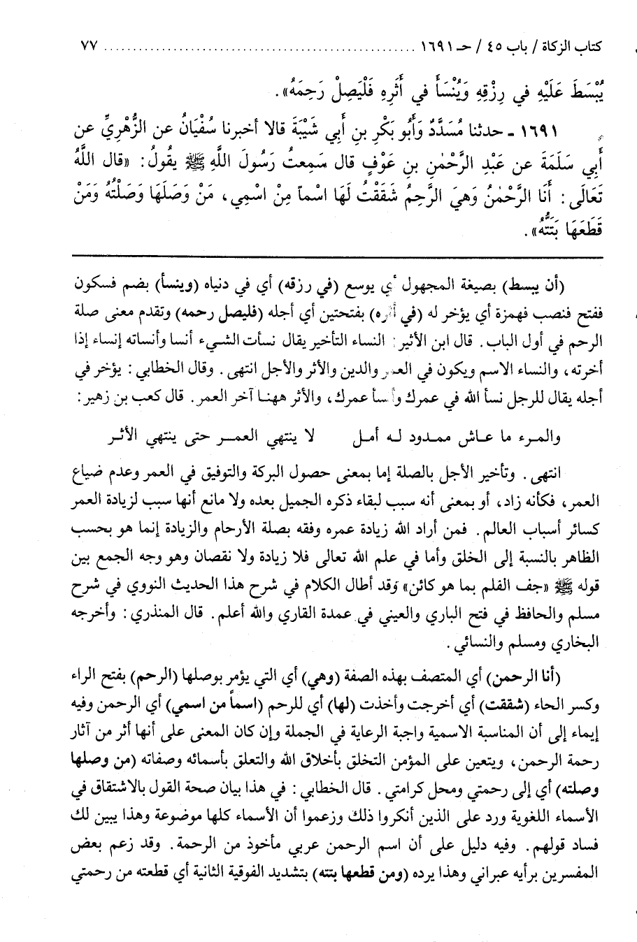 وَتَأْخِيرُ الْأَجَلِ بِالصِّلَةِ إِمَّا بِمَعْنَى حُصُولِ الْبَرَكَةِ وَالتَّوْفِيقِ فِي الْعُمْرِ وَعَدَمِ ضَيَاعِ الْعُمُرِ فَكَأَنَّهُ زَادَ أَوْ بِمَعْنَى أَنَّهُ سَبَبٌ لِبَقَاءِ ذِكْرِهِ الْجَمِيلِ بَعْدَهُ وَلَا مَانِعَ أَنَّهَا سَبَبٌ لِزِيَادَةِ الْعُمُرِ كَسَائِرِ أسباب العالم ممن أَرَادَ اللَّهُ زِيَادَةَ عُمُرِهِ وَفَّقَهُ بِصِلَةِ الْأَرْحَامِ والزيادة إنما هو بِحَسَبِ الظَّاهِرِ بِالنِّسْبَةِ إِلَى الْخَلْقِ وَأَمَّا فِي عِلْمِ اللَّهِ تَعَالَى فَلَا زِيَادَةَ وَلَا نُقْصَانَ وَهُوَ وَجْهُ الْجَمْعِ بَيْنَ قَوْلِهِ صَلَّى اللَّهُ عَلَيْهِ وَسَلَّمَ جَفَّ الْقَلَمُ بِمَا هُوَ كَائِنٌ وَقَدْ أَطَالَ الْكَلَامَ فِي شَرْحِ هَذَا الْحَدِيثِ النَّوَوِيُّ فِي شَرْحِ مُسْلِمٍ وَالْحَافِظُ فِي فَتْحِ الباري والعيني في عمدة القارىء وَاللَّهُ أَعْلَمُ