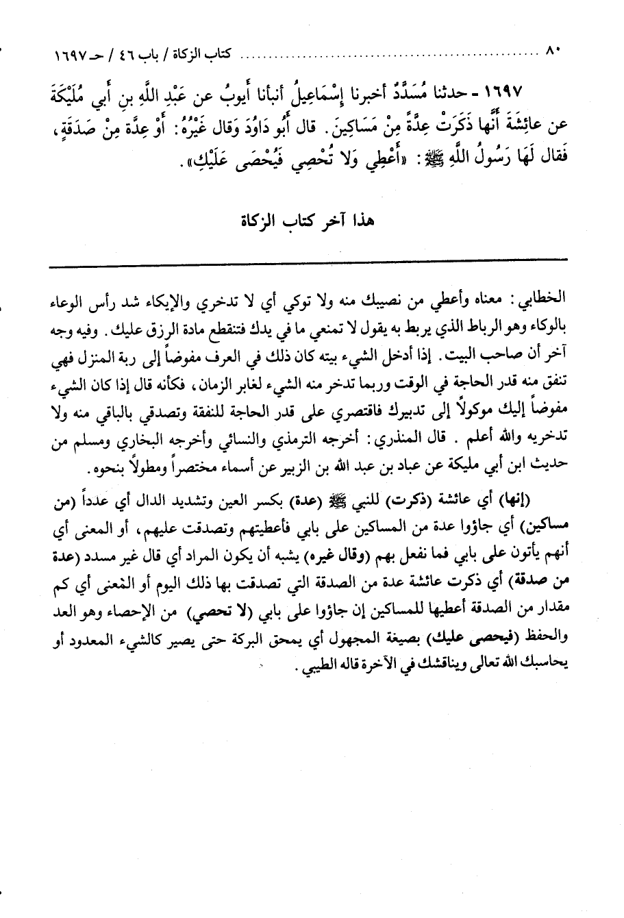[1700] (أَنَّهَا) أَيْ عَائِشَةَ (ذَكَرَتْ) لِلنَّبِيِّ صَلَّى اللَّهُ عَلَيْهِ وَسَلَّمَ (عِدَّةً) بِكَسْرِ الْعَيْنِ وَتَشْدِيدِ الدَّالِ أي عددا (من مساكين) أي جاؤوا عِدَّةٌ مِنَ الْمَسَاكِينِ عَلَى بَابِي فَأَعْطَيْتُهُمْ وَتَصَدَّقْتُ عَلَيْهِمْ أَوِ الْمَعْنَى أَيْ أَنَّهُمْ يَأْتُونَ عَلَى بَابِي فَمَا نَفْعَلُ بِهِمْ (وَقَالَ غَيْرُهُ) يُشْبِهُ أَنْ يَكُونَ الْمُرَادُ أَيْ قَالَ غَيْرُ مُسَدَّدٍ (عِدَّةً مِنْ صَدَقَةٍ) أَيْ ذَكَرَتْ عَائِشَةُ عِدَّةً مِنَ الصَّدَقَةِ الَّتِي تَصَدَّقَتْ بِهَا ذَلِكَ الْيَوْمِ أَوِ الْمَعْنَى أَيْ كَمْ مِقْدَارٌ مِنَ الصَّدَقَةِ أعطيها للمساكين إن جاؤوا عَلَى بَابِي (لَا تُحْصِي) مِنَ الْإِحْصَاءِ وَهُوَ الْعَدُّ وَالْحِفْظُ (فَيُحْصَى عَلَيْكِ) بِصِيغَةِ الْمَجْهُولِ أَيْ يُمْحَقُ الْبَرَكَةُ حَتَّى يَصِيرَ كَالشَّيْءِ الْمَعْدُودِ أَوْ يُحَاسِبُكِ اللَّهُ تَعَالَى وَيُنَاقِشُكِ فِي الْآخِرَةِ قَالَهُ الطِّيبِيُّ
