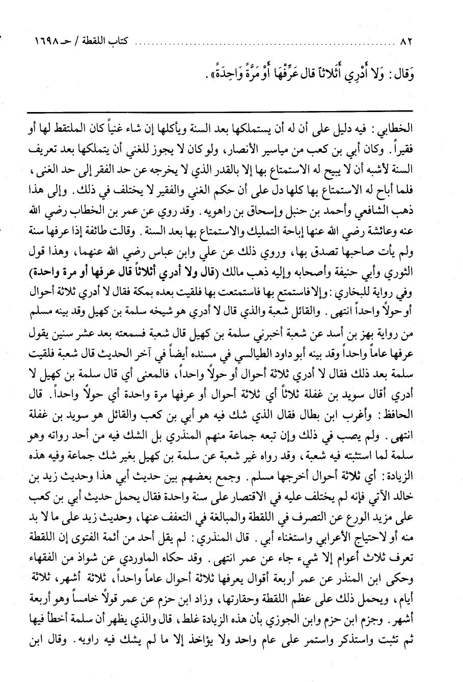 قَالَ الْمُنْذِرِيُّ لَمْ يَقُلْ أَحَدٌ مِنْ أَئِمَّةِ الْفَتْوَى إِنَّ اللُّقَطَةَ تُعَرَّفُ ثَلَاثَةَ أَعْوَامٍ إِلَّا شَيْءٌ جَاءَ عَنْ عُمَرَ انْتَهَى