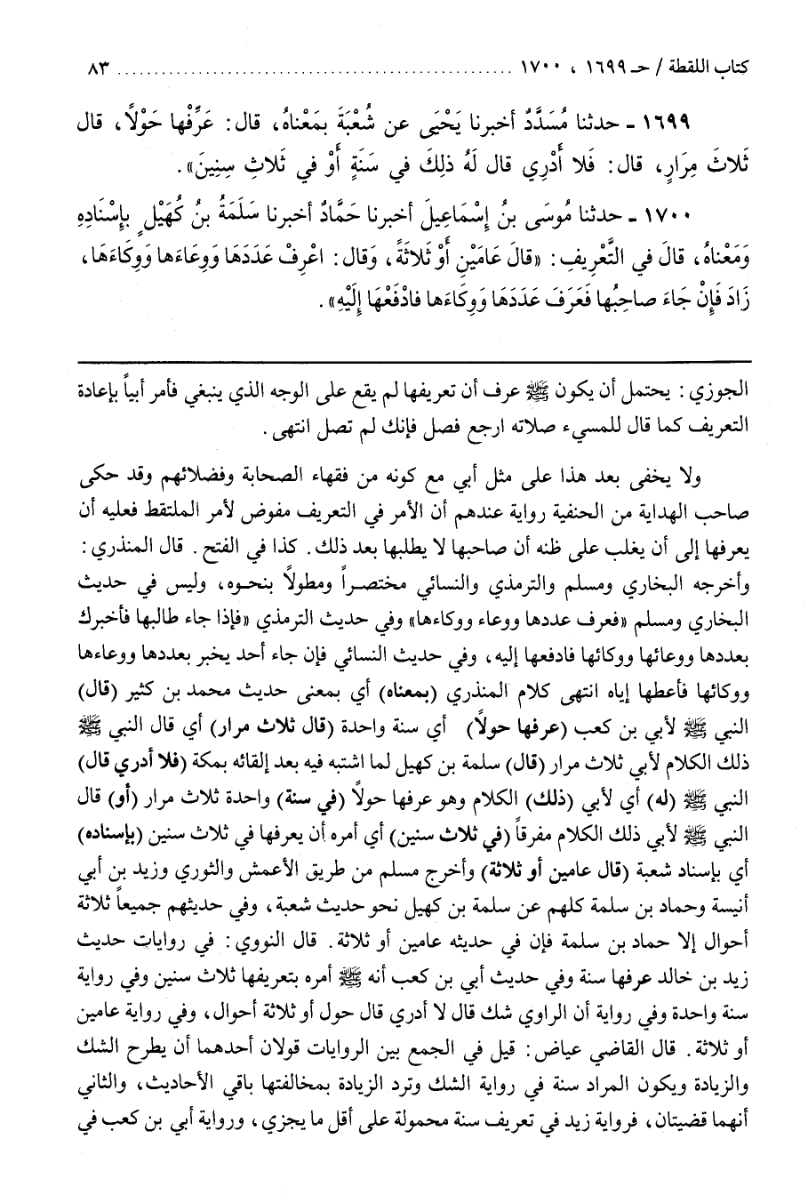 قَالَ النَّوَوِيُّ فِي رِوَايَاتِ حَدِيثِ زَيْدِ بْنِ خَالِدٍ عَرِّفْهَا سَنَةً وَفِي حَدِيثِ أبي بن كعب أنه أَمَرَهُ بِتَعْرِيفِهَا ثَلَاثَ سِنِينَ وَفِي رِوَايَةٍ سَنَةً وَاحِدَةً وَفِي رِوَايَةٍ أَنَّ الرَّاوِيَ شَكَّ قَالَ لَا أَدْرِي قَالَ حَوْلٌ أَوْ ثَلَاثَةُ أَحْوَالٍ وَفِي رِوَايَةِ عَامَيْنِ أَوْ ثَلَاثَةٍ
