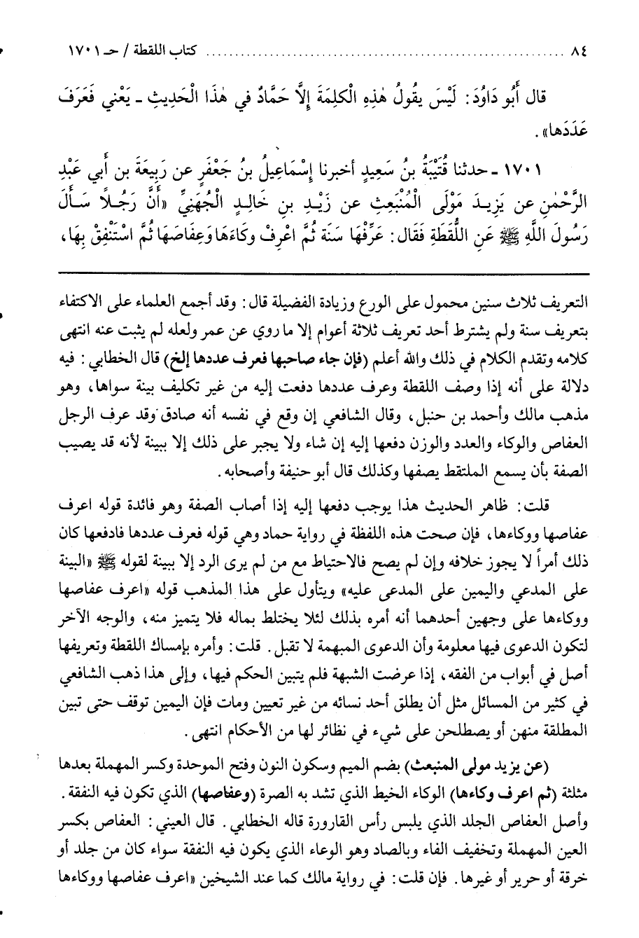 [1704] (عَنْ يَزِيدَ مَوْلَى الْمُنْبَعِثِ) بِضَمِّ الْمِيمِ وَسُكُونِ النُّونِ وَفَتْحِ الْمُوَحَّدَةِ وَكَسْرِ الْمُهْمَلَةِ بَعْدَهَا مُثَلَّثَةٌ (ثُمَّ اعْرِفْ وِكَاءَهَا) الْوِكَاءُ الْخَيْطُ الَّذِي تُشَدُّ بِهِ الصُّرَّةُ (وَعِفَاصَهَا) الَّذِي تَكُونُ فِيهِ النَّفَقَةُ