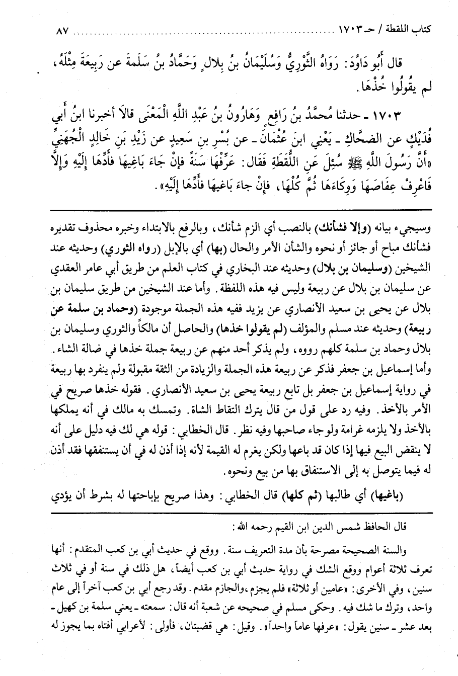 وَسَيَجِيءُ بَيَانُهُ (وَإِلَّا فَشَأْنَكَ) بِالنَّصْبِ أَيِ الْزَمْ شَأْنَكَ وَبِالرَّفْعِ بِالِابْتِدَاءِ وَخَبَرُهُ مَحْذُوفٌ تَقْدِيرُهُ فَشَأْنُكَ مُبَاحٌ أَوْ جَائِزٌ أَوْ نَحْوُهُ وَالشَّأْنُ الْأَمْرُ وَالْحَالُ (بِهَا) أَيْ بِالْإِبِلِ (رَوَاهُ الثَّوْرِيُّ) وَحَدِيثُهُ عِنْدَ الشَّيْخَيْنِ (وَسُلَيْمَانُ بْنُ بِلَالٍ) وَحَدِيثُهُ عِنْدَ الْبُخَارِيِّ فِي كِتَابِ الْعِلْمِ مِنْ طَرِيقِ أَبِي عَامِرٍ الْعَقَدِيِّ عَنْ سُلَيْمَانَ بْنِ بِلَالٍ عَنْ رَبِيعَةَ وَلَيْسَ فِيهِ هَذِهِ اللَّفْظَةُ