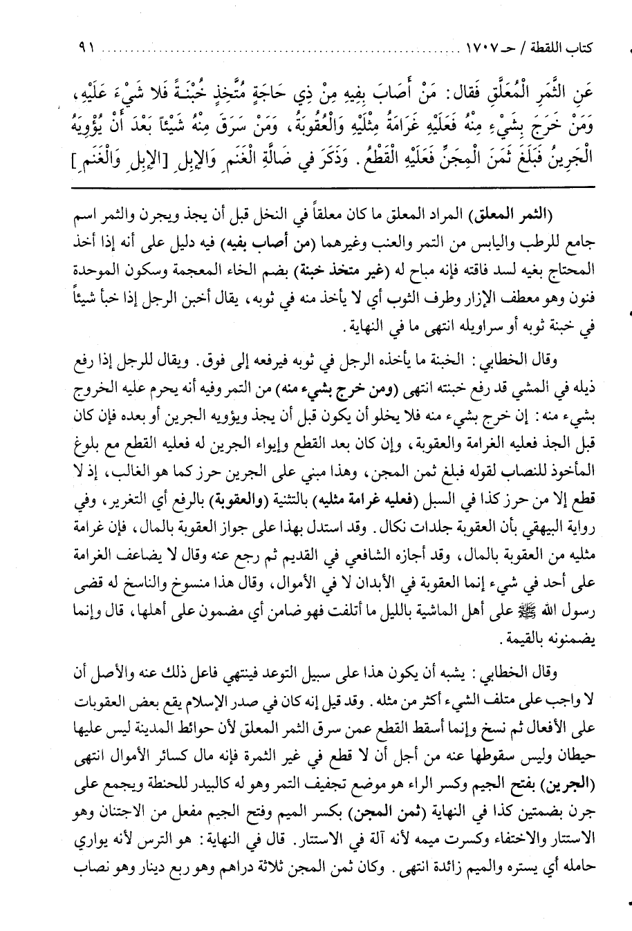 [1710] (الثَّمَرِ الْمُعَلَّقِ) الْمُرَادُ بِالثَّمَرِ الْمُعَلَّقِ مَا كَانَ مُعَلَّقًا فِي النَّخْلِ قَبْلَ أَنْ يُجَذَّ وَيُجْرَنَ وَالثَّمَرُ اسْمٌ جَامِعٌ لِلرَّطْبِ وَالْيَابِسِ مِنَ التَّمْرِ وَالْعِنَبِ وَغَيْرِهِمَا (مَنْ أَصَابَ بِفِيهِ) فِيهِ دَلِيلٌ عَلَى أَنَّهُ إِذَا أَخْذَ الْمُحْتَاجُ بِفِيهِ لِسَدِّ فَاقَتِهِ فَإِنَّهُ مُبَاحٌ لَهُ (غَيْرَ مُتَّخِذٍ خُبْنَةً) بِضَمِّ الْخَاءِ الْمُعْجَمَةِ وَسُكُونِ الْمُوَحَّدَةِ فَنُونٍ وَهُوَ مِعْطَفُ الْإِزَارِ وَطَرْفُ الثَّوْبِ أَيْ لَا يَأْخُذْ مِنْهُ فِي ثَوْبِهِ يُقَالُ أَخْبَنَ الرَّجُلُ إِذَا خَبَّأَ شَيْئًا فِي خُبْنَةِ ثَوْبِهِ أَوْ سَرَاوِيلِهِ انْتَهَى مَا فِي النِّهَايَةِ