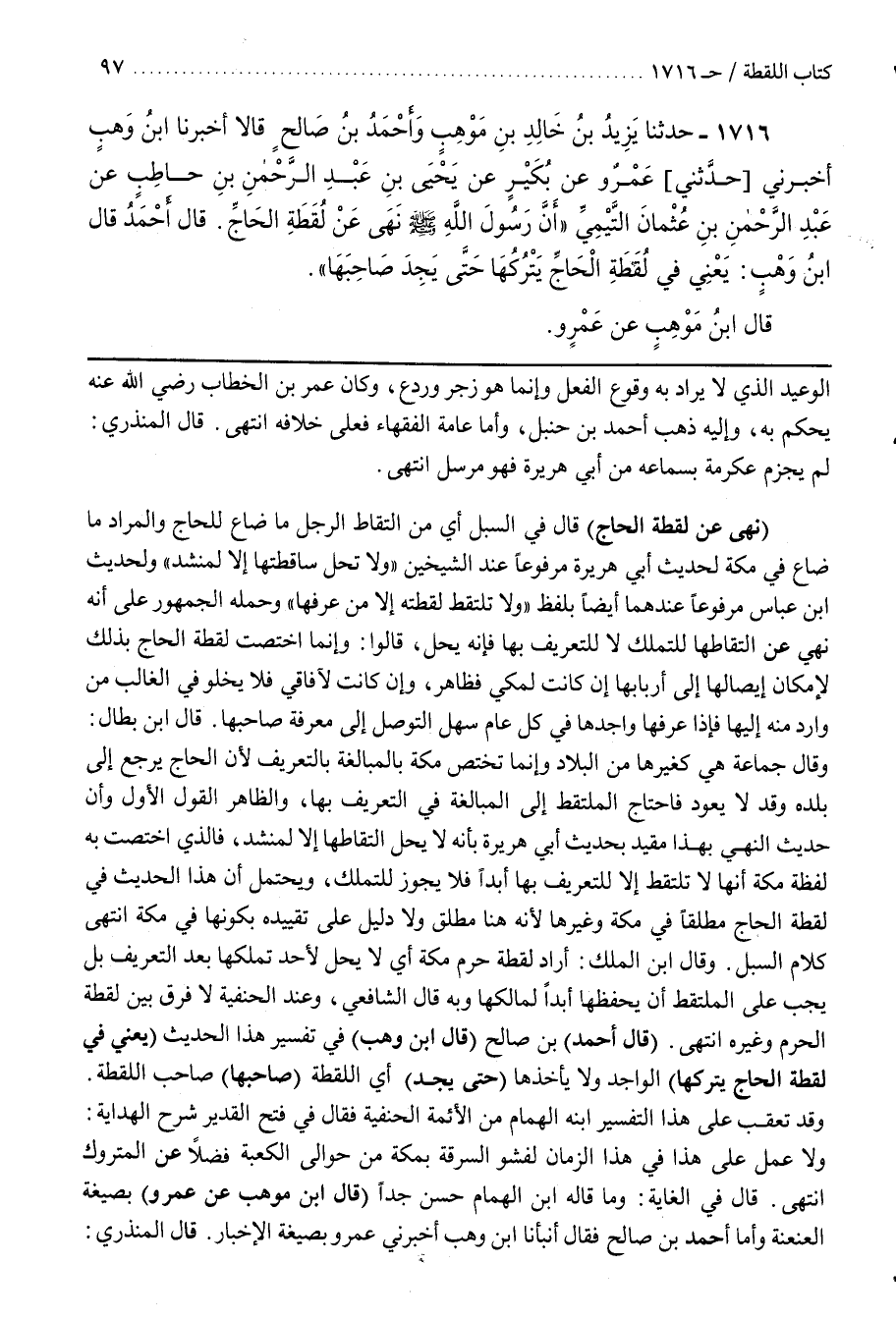 وقال بن الْمَلِكِ أَرَادَ لُقَطَةَ حَرَمِ مَكَّةَ أَيْ لَا محل لِأَحَدٍ تَمَلُّكُهَا بَعْدَ التَّعْرِيفِ بَلْ يَجِبُ عَلَى الْمُلْتَقِطِ أَنْ يَحْفَظَهَا أَبَدًا لِمَالِكِهَا وَبِهِ قَالَ الشَّافِعِيُّ وَعِنْدَ الْحَنَفِيَّةِ لَا فَرْقَ بَيْنَ لُقَطَةِ الْحَرَمِ وَغَيْرِهِ انْتَهَى (قَالَ أَحْمَدُ) بْنُ صَالِحٍ (قال بن وَهْبٍ) فِي تَفْسِيرِ هَذَا الْحَدِيثِ (يَعْنِي فِي لُقَطَةِ الْحَاجِّ يَتْرُكُهَا) الْوَاجِدُ وَلَا يَأْخُذُهَا (حَتَّى يَجِدَهَا) أَيِ اللُّقَطَةَ (صَاحِبُهَا) صَاحِبُ اللُّقَطَةِ