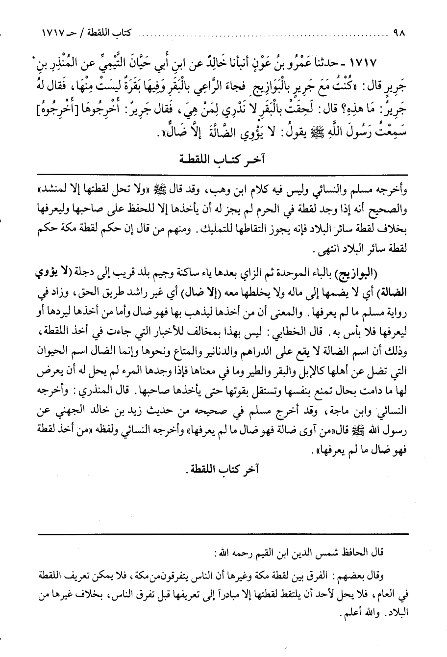 قَالَ المنذري وأخرجه النسائي وبن مَاجَهْ وَقَدْ أَخْرَجَ مُسْلِمٌ فِي صَحِيحِهِ مِنْ حَدِيثِ زَيْدِ بْنِ خَالِدٍ الْجُهَنِيِّ عَنْ رَسُولِ الله قَالَ مَنْ آوَى ضَالَّةً فَهُوَ ضَالٌّ مَا لَمْ يُعَرِّفْهَا وَأَخْرَجَهُ النَّسَائِيُّ وَلَفْظُهُ مَنْ أَخَذَ لُقَطَةً فَهُوَ ضَالٌّ مَا لَمْ يُعَرِّفْهَا آخِرُ كتاب اللقطة