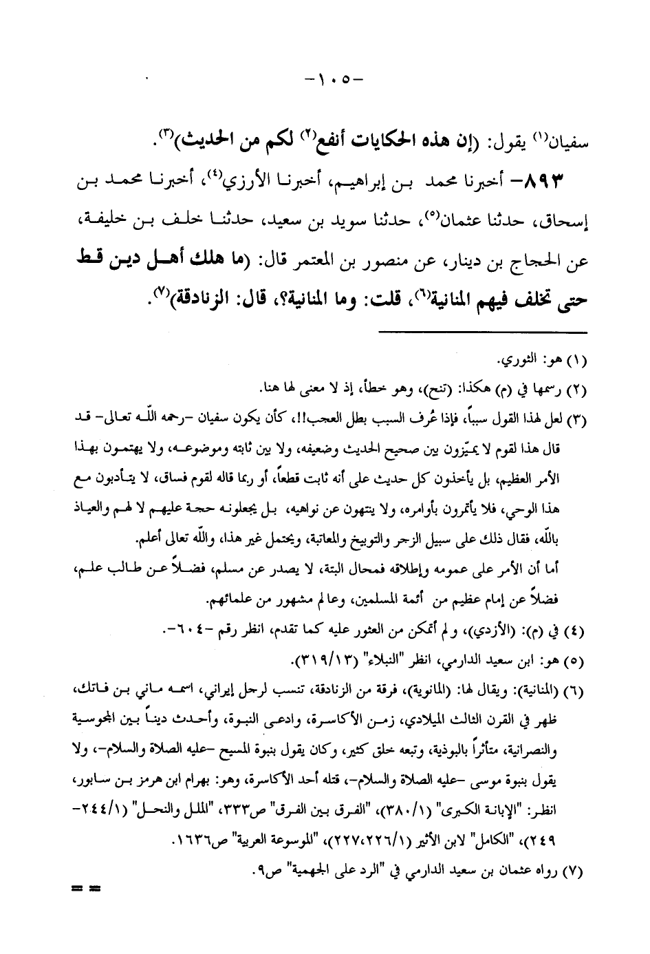 893 - أَخْبَرَنَا مُحَمَّدُ بْنُ إِبْرَاهِيمَ أَخْبَرَنَا الْأُرْزِيُّ أَخْبَرَنَا مُحَمَّدُ بْنُ إِسْحَاقَ حَدَّثَنَا عُثْمَانُ حَدَّثَنَا سُوَيْدُ بْنُ سَعِيدٍ حَدَّثَنَا خَلَفُ بْنُ خَلِيفَةَ عَنِ الْحَجَّاجِ بْنِ دِينَارٍ عَنْ مَنْصُورِ بْنِ الْمُعْتَمِرِ قَالَ (مَا هَلَكَ أَهْلُ دِينٍ قَطُّ حَتَّى تَخْلُفَ فِيهِمُ الْمَنَّانِيَّةُ قُلْتُ وَمَا الْمَنَّانِيَّةُ قَالَ الزَّنَادِقَةُ)