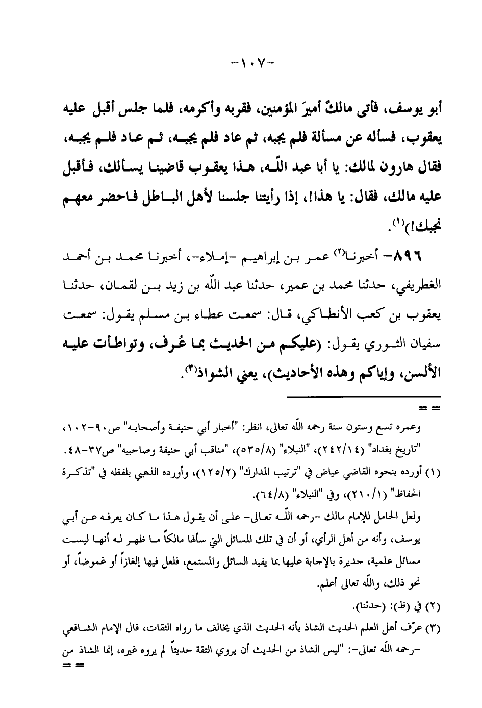 896 - أَخْبَرَنَا عُمَرُ بْنُ إِبْرَاهِيمَ إِمْلَاءً أَخْبَرَنَا مُحَمَّدُ بْنُ أَحْمَدَ الْغِطْرِيفِيُّ حَدَّثَنَا مُحَمَّدُ بْنُ عُمَيْرٍ حَدَّثَنَا عَبْدُ اللَّهِ بْنُ زَيْدِ بْنِ لُقْمَانَ حَدَّثَنَا يَعْقُوبُ بْنُ كَعْبٍ الْأَنْطَاكِيُّ قَالَ سَمِعْتُ عَطَاءَ بْنَ مُسْلِمٍ يَقُولُ سَمِعْتُ سُفْيَانَ الثَّوْرِيَّ يَقُولُ (عَلَيْكُمْ مِنَ الْحَدِيثِ بِمَا عُرِفَ وَتَوَاطَأَتْ عَلَيْهِ الْأَلْسُنُ وَإِيَّاكُمْ وَهَذِهِ الْأَحَادِيثَ) يَعْنِي الشَّوَاذَ
