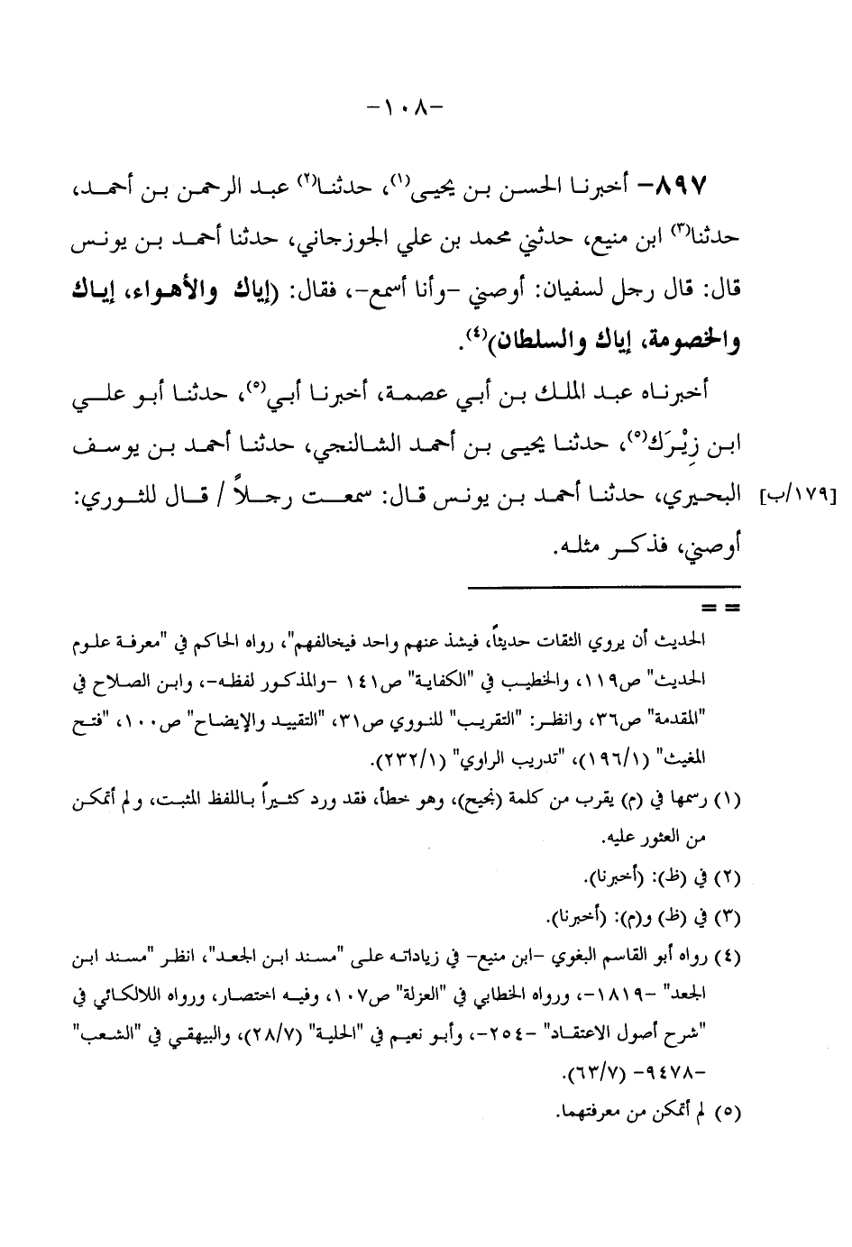 897 - أَخْبَرَنَا الْحَسَنُ بْنُ يَحْيَى حَدَّثَنَا عَبْدُ الرَّحْمَنِ بْنُ أَحْمَدَ حَدَّثَنَا ابْنُ مَنِيعٍ حَدَّثَنِي مُحَمَّدُ بْنُ عَلِيٍّ الْجَوْزَجَانِيُّ حَدَّثَنَا أَحْمَدُ بْنُ يُونُسَ قَالَ قَالَ رَجُلٌ لِسُفْيَانَ أَوْصِنِي وَأَنَا أَسْمَعُ فَقَالَ (إِيَّاكَ وَالْأَهْوَاءَ إِيَّاكَ وَالْخُصُومَةَ إِيَّاكَ وَالسُّلْطَانَ)