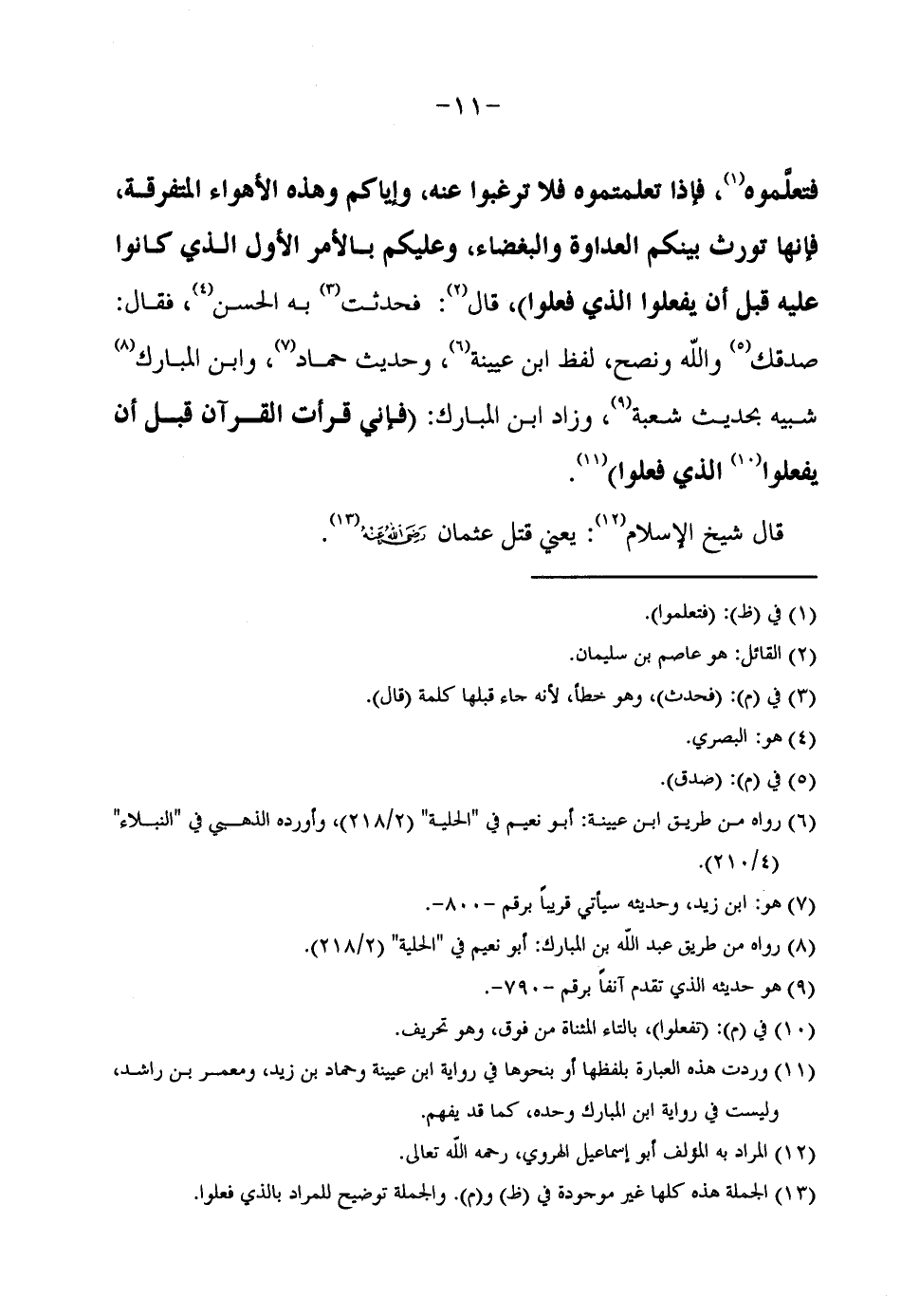 فَتَعَلَّمُوهُ فَإِذَا تَعَلَّمْتُمُوهُ فَلَا تَرْغَبُوا عَنْهُ وَإِيَّاكُمْ وَهَذِهِ الْأَهْوَاءَ الْمُتَفَرِّقَةَ فَإِنَّهَا تُورِثُ بَيْنَكُمُ الْعَدَاوَةَ وَالْبَغْضَاءَ وَعَلَيْكُمْ بِالْأَمْرِ الْأَوَّلِ الَّذِي كَانُوا عَلَيْهِ قَبْلَ أَنْ يَفْعَلُوا الَّذِي فَعَلُوا) قَالَ فَحَدَّثْتُ بِهِ الْحَسَنَ فَقَالَ صَدَقَكَ وَاللَّهِ وَنَصَحَ لَفْظُ ابْنِ عُيَيْنَةَ وَحَدِيثُ حَمَّادٍ وَابْنِ الْمُبَارَكِ شَبِيهٌ بِحَدِيثِ شُعْبَةَ وَزَادَ ابْنُ الْمُبَارَكِ (فَإِنِّي قَرَأْتُ الْقُرْآنَ قَبْلَ أَنْ يَفْعَلُوا الَّذِي فَعَلُوا)