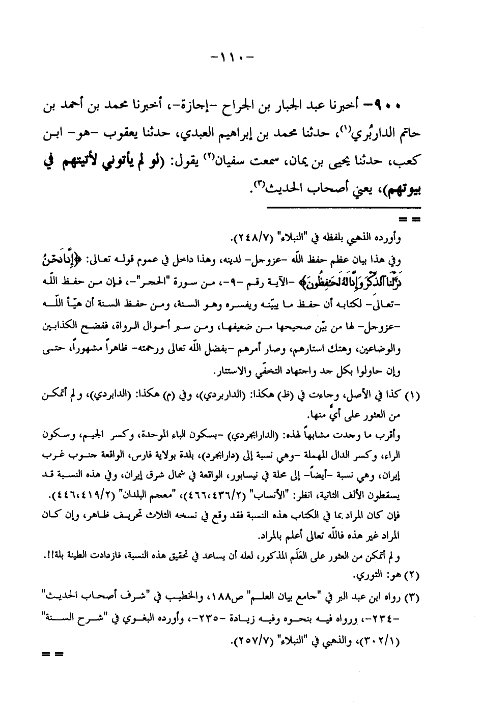 أَخْبَرَنَا عَبْدُ الْجَبَّارِ بْنُ الْجَرَّاحِ إِجَازَةً أَخْبَرَنَا مُحَمَّدُ بْنُ أَحْمَدَ بْنِ حَاتِمٍ الدَّارُبْرِيُّ حَدَّثَنَا مُحَمَّدُ بْنُ إِبْرَاهِيمَ الْعَبْدِيُّ حَدَّثَنَا يَعْقُوبُ هُوَ ابْنُ كَعْبٍ حَدَّثَنَا يَحْيَى بْنُ يمَان سَمِعت سُفْيَان يَقُول (لولم يَأْتُونِي لَأَتَيْتُهُمْ فِي بِيُوتِهِمْ) يَعْنِي أَصْحَاب الحَدِيث