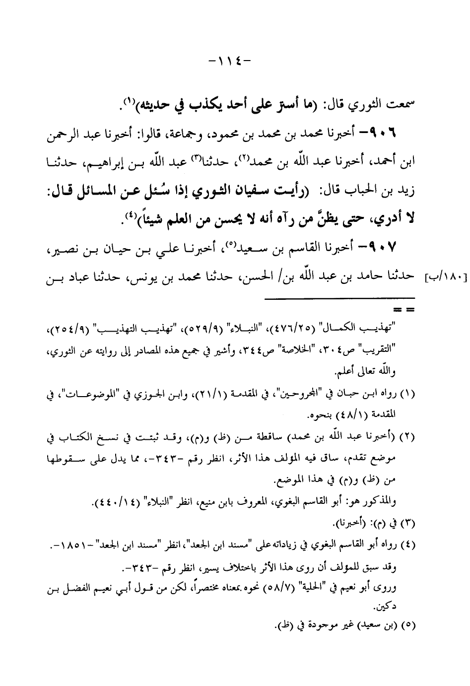 906 - أَخْبَرَنَا مُحَمَّدُ بْنُ مُحَمَّدِ بْنِ مَحْمُودٍ وَجَمَاعَةٌ قَالَوا أَخْبَرَنَا عَبْدُ الرَّحْمَن ابْن أَحْمَدَ أَخْبَرَنَا عَبْدُ اللَّهِ بْنُ مُحَمَّدٍ حَدَّثَنَا عَبْدُ اللَّهِ بْنُ إِبْرَاهِيمَ حَدَّثَنَا زَيْدُ بْنُ الْحُبَابِ قَالَ (رَأَيْتُ سُفْيَانَ الثَّوْرِيَّ إِذَا سُئِلَ عَن الْمسَائِل قَالَ لاأدري حتَّى يَظُنَّ مَنْ رَآهُ أَنَّهُ لَا يُحْسِنُ مِنَ الْعِلْمِ شَيْئًا)