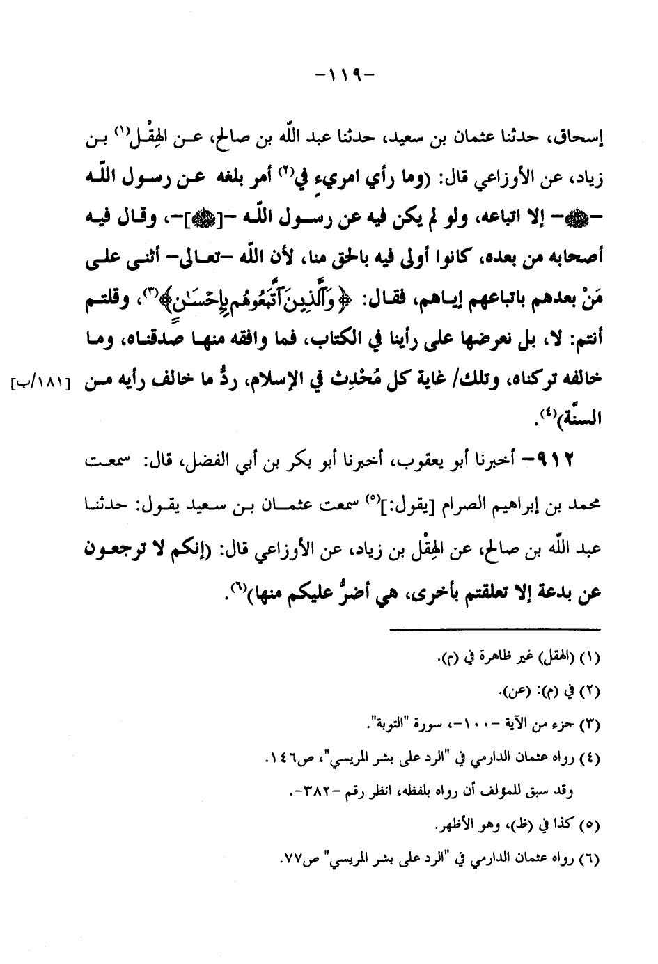 إِسْحَاقَ حَدَّثَنَا عُثْمَانُ بْنُ سَعِيدٍ حَدَّثَنَا عَبْدُ اللَّهِ بْنُ صَالِحٍ عَنِ الْهِقْلِ بْنِ زِيَادٍ عَنِ الْأَوْزَاعِيّ قَالَ (وَمَا رَأْي امريء فِي أَمْرٍ بَلَغَهُ عَنْ رَسُولِ اللَّهِ صَلَّى اللَّهُ عَلَيْهِ وَسَلَّمَ إِلَّا اتِّبَاعُهُ وَلَوْ لَمْ يَكُنْ فِيهِ عَنْ رَسُولِ اللَّهِ صَلَّى اللَّهُ عَلَيْهِ وَسَلَّمَ وَقَالَ فِيهِ أَصْحَابُهُ مِنْ بَعْدِهِ كَانُوا أَوْلَى فِيهِ بِالْحَقِّ مِنَّا لِأَنَّ اللَّهَ تَعَالَى أَثْنَى عَلَى مَنْ بَعْدَهُمْ بْاتِّبَاعِهِمْ إِيَّاهُمْ فَقَالَ {وَالَّذِينَ اتَّبَعُوهُمْ بِإِحْسَان} وَقُلْتُمْ أَنْتُمْ لَا بَلْ نَعْرِضُهَا عَلَى رَأْيِنَا فِي الْكِتَابِ فَمَا وَافَقَهُ مِنْهَا صَدَّقْنَاهُ وَمَا خَالَفَهُ تَرَكْنَاهُ وَتِلْكَ غَايَةُ كُلِّ مُحْدِثٍ فِي الْإِسْلَامِ رَدُّ مَا خَالَفَ رَأْيَهُ مِنَ السُّنَّةِ)