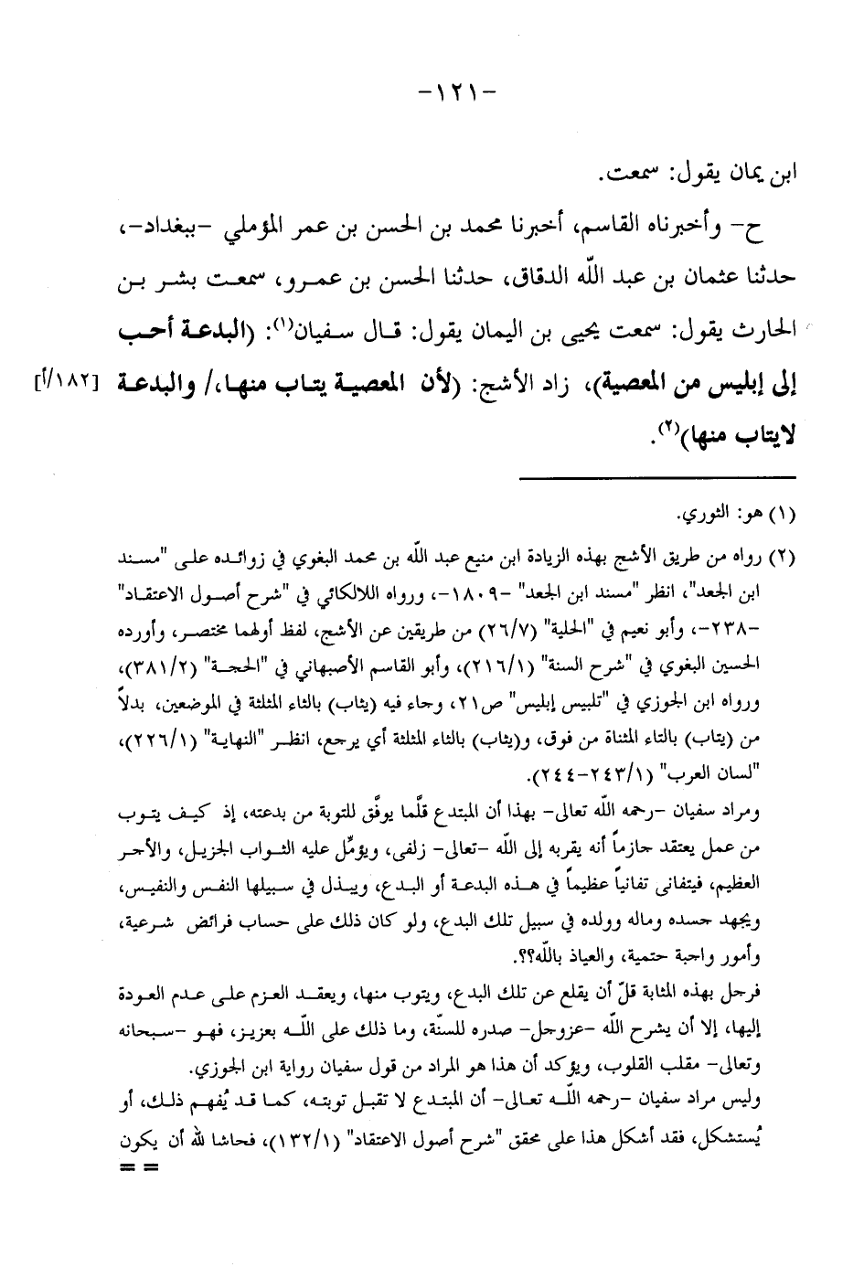 ح وَأَخْبَرَنَاهُ الْقَاسِمُ أَخْبَرَنَا مُحَمَّدُ بْنُ الْحَسَنِ بْنِ عُمَرَ الْمُؤَمَّلِيُّ بِبَغْدَادَ حَدَّثَنَا عُثْمَانُ بْنُ عَبْدِ اللَّهِ الدَّقَّاقُ حَدَّثَنَا الْحَسَنُ بْنُ عَمْرٍو سَمِعْتُ بِشْرَ بْنَ الْحَارِثِ يَقُولُ سَمِعْتُ يَحْيَى بْنَ الْيَمَانِ يَقُولُ قَالَ سُفْيَانُ (الْبِدْعَةُ أَحَبُّ إِلَى إِبْلِيسِ مِنَ الَمْعَصِيَّةِ) زَادَ الْأَشَجُّ (لَأَنَّ الْمَعْصِيَّةَ يُتَابُ مِنْهَا وَالْبِدْعَةَ لَا يُتَابُ مِنْهَا)