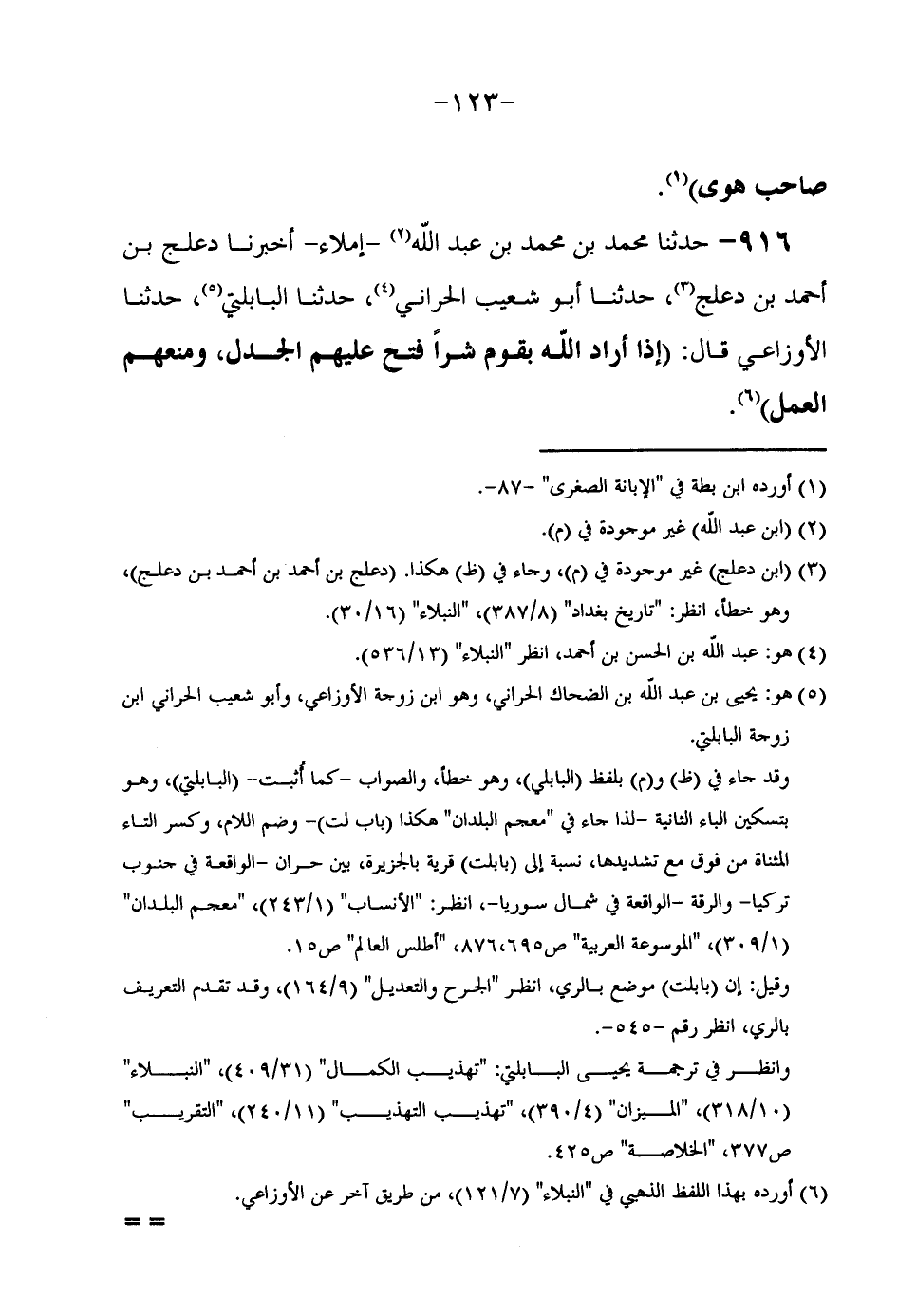 916 - حَدَّثَنَا مُحَمَّدُ بْنُ مُحَمَّدِ بْنِ عَبْدِ اللَّهِ إِمْلَاءً أَخْبَرَنَا دَعْلَجُ بْنُ أَحْمَدَ بْنِ دَعْلَجٍ حَدَّثَنَا أَبُو شُعَيْبٍ الْحَرَّانِيُّ حَدَّثَنَا الْبَابَلْتِيُّ حَدَّثَنَا الْأَوْزَاعِيُّ قَالَ (إِذَا أَرَادَ اللَّهُ بِقَوْمٍ شَرًّا فَتَحَ عَلَيْهِمُ الْجَدَلَ وَمَنَعَهُمُ الْعَمَلَ)