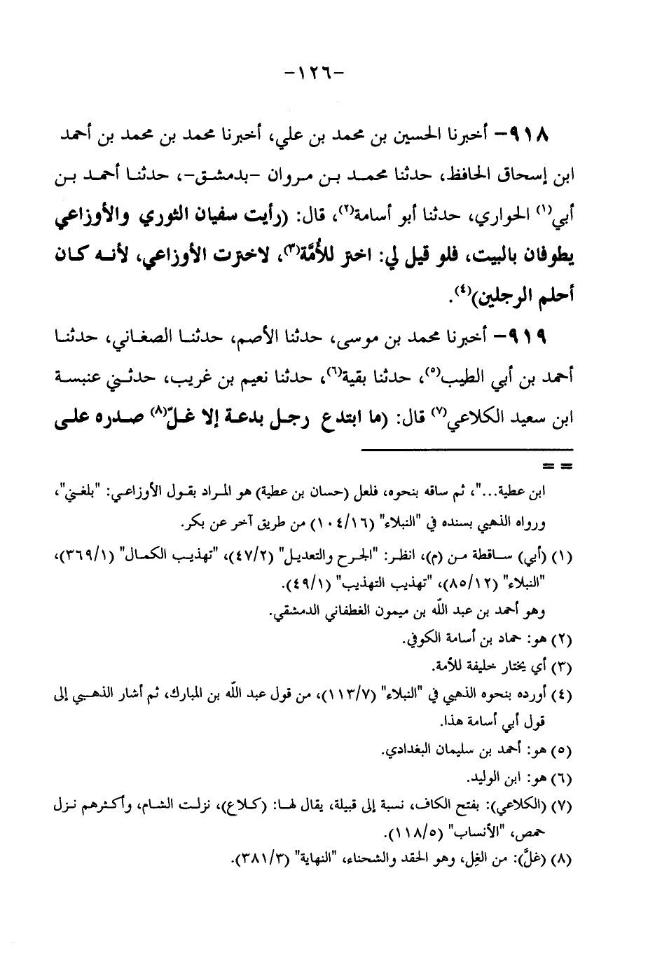 918 - أَخْبَرَنَا الْحُسَيْنُ بْنُ مُحَمَّدِ بْنِ عَلِيٍّ أَخْبَرَنَا مُحَمَّدُ بْنُ مُحَمَّدٍ بن أَحْمد ابْن إِسْحَاقَ الْحَافِظُ حَدَّثَنَا مُحَمَّدُ بْنُ مَرْوَانَ بِدِمَشْقَ حَدَّثَنَا أَحْمَدُ بْنُ أَبِي الْحَوَارِيِّ حَدَّثَنَا أَبُو أُسَامَةَ قَالَ (رَأَيْتُ سُفْيَانَ الثَّوْرِيَّ وَالْأَوْزَاعِيَّ يَطُوفَانِ بِالْبَيْتِ فَلَوْ قِيلَ لِي اخْتَرْ لُلْأُمَّةِ لَاخْتَرْتُ الْأَوْزَاعِيَّ لَأَنَّهُ كَانَ أَحْلَمَ الرَّجُلَيْنِ)