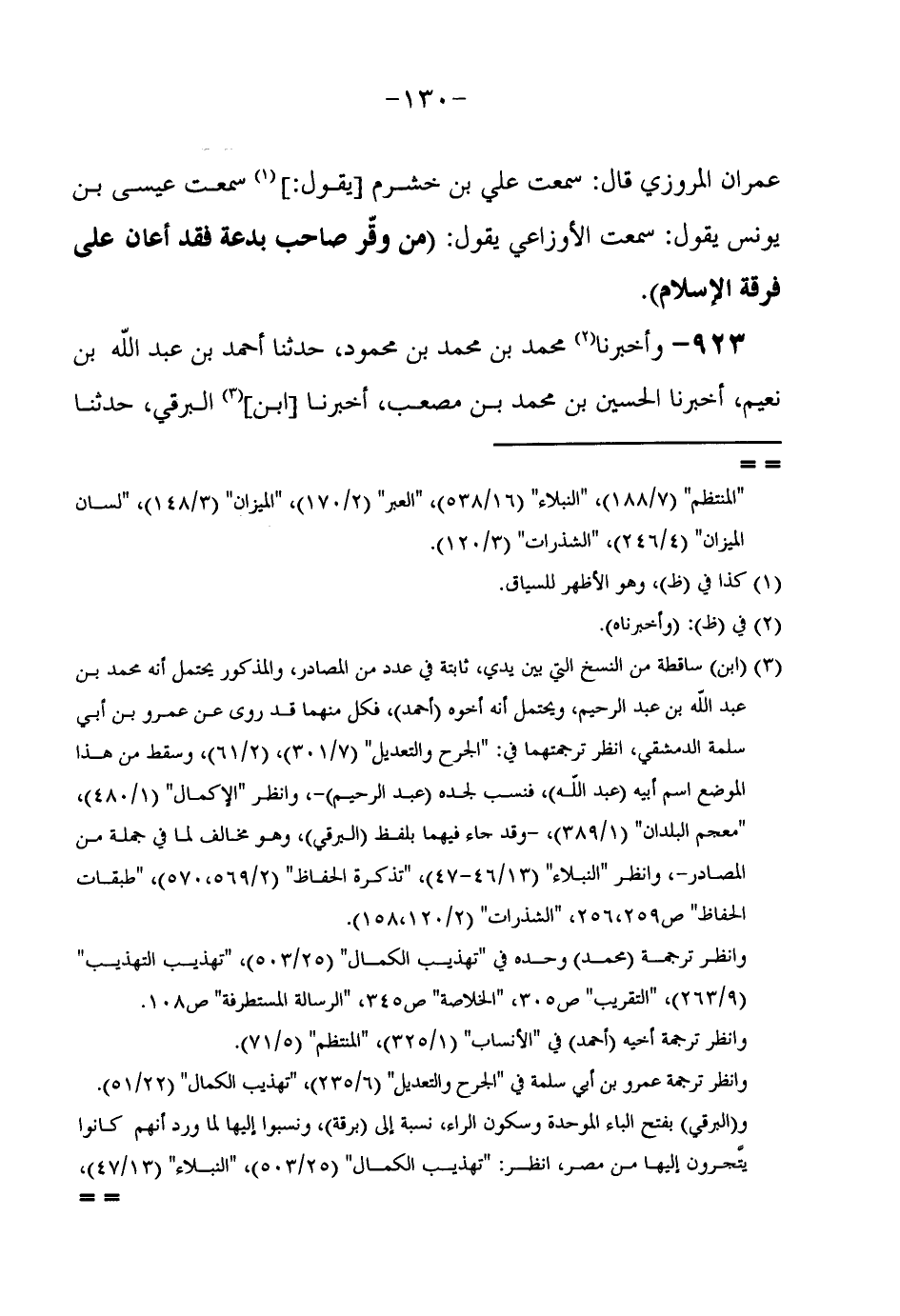 923 - وَأَخْبَرَنَا مُحَمَّدُ بْنُ مُحَمَّدِ بْنِ مَحْمُودٍ حَدَّثَنَا أَحْمَدُ بْنُ عَبْدِ اللَّهِ بْنِ نُعَيْمٍ أَخْبَرَنَا الْحُسَيْنُ بْنُ مُحَمَّدِ بْنِ مُصْعَبٍ أَخْبَرَنَا ابْنُ الْبَرْقِيِّ حَدَّثَنَا