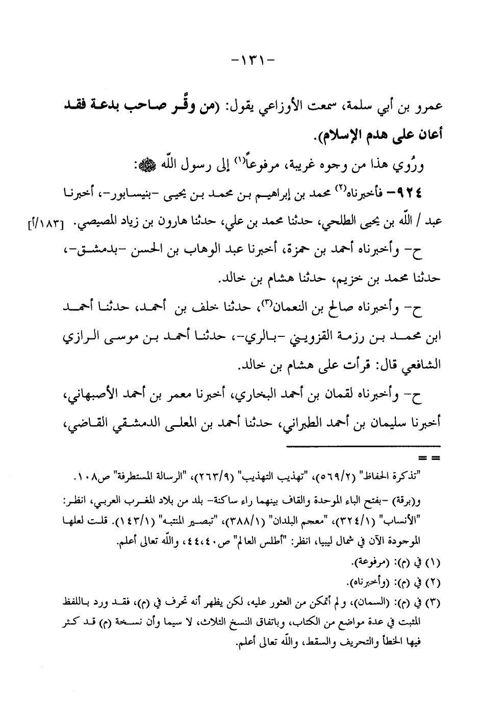 عَمْرُو بْنُ أَبِي سَلَمَةَ سَمِعْتُ الْأَوْزَاعِيَّ يَقُولُ (مَنْ وَقَرَ صَاحِبَ بِدْعَةٍ فَقَدْ أَعَانَ عَلَى هَدْمِ الْإِسْلَامِ)