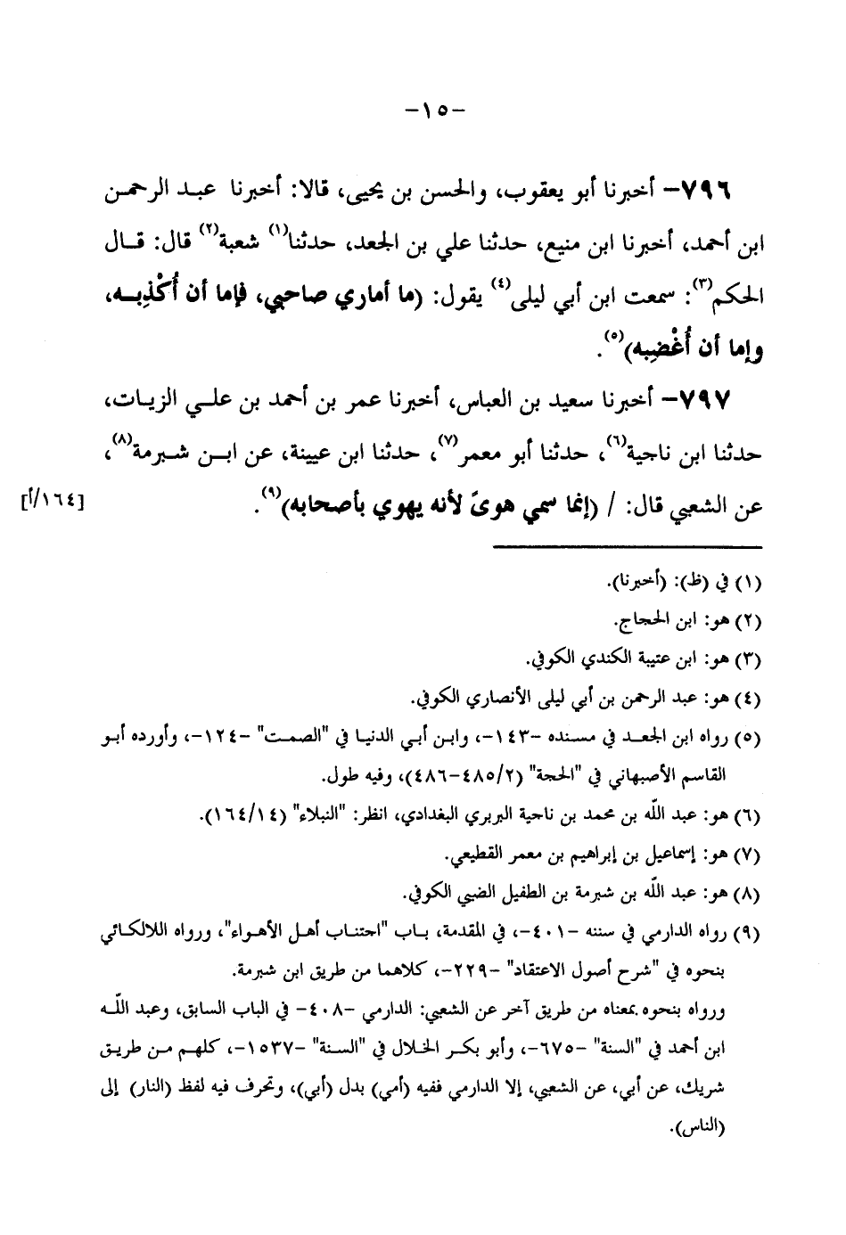 796 - أَخْبَرَنَا أَبُو يَعْقُوبَ وَالْحَسَنُ بْنُ يَحْيَى قالَا أَخْبَرَنَا عَبْدُ الرَّحْمَنِ ابْن أَحْمَدَ أَخْبَرَنَا ابْنُ مَنِيعٍ حَدَّثَنَا عَلِيُّ بْنُ الْجَعْدِ حَدَّثَنَا شُعْبَةُ قَالَ قَالَ الْحَكَمُ سَمِعْتُ ابْنَ أَبِي لَيْلَى يَقُولُ (مَا أُمَارِي صَاحِبِي فَإِمَّا أَنْ أُكْذِبَهُ وَإِمَّا أَنْ أُغْضِبَهُ)
