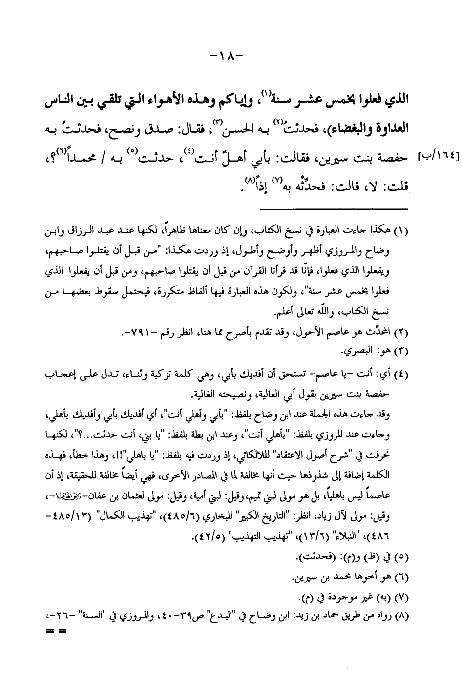 الَّذِي فعلوا بِخمْس عشر سَنَةً وَإِيَّاكُمْ وَهَذِهِ الْأَهْوَاءَ الَّتِي تُلْقِي بَيْنَ النَّاسِ الْعَدَاوَةَ وَالْبَغْضَاءَ) فَحَدَّثْتُ بِهِ الْحَسَنَ فَقَالَ صَدَقَ وَنَصَحَ فَحَدَّثْتُ بِهِ حَفْصَةَ بِنْتَ سِيرِينَ فَقَالَتْ بِأَبِي أَهْلٌ أَنْتَ حدَّثْتَ بِهِ مُحَمَّدًا قُلْتُ لَا قَالَتْ فَحَدِّثْهُ بِهِ إِذًا