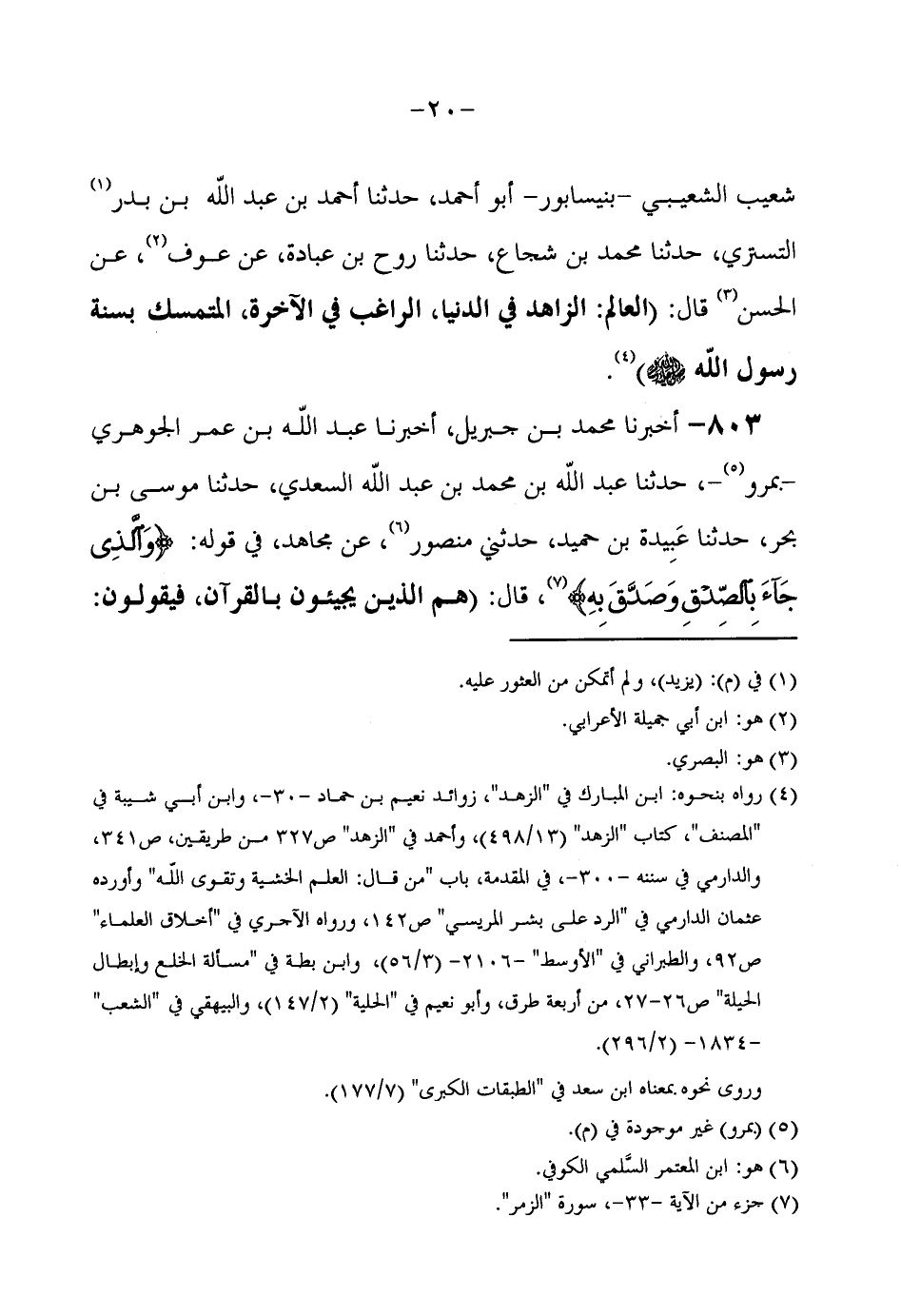 شُعَيْبٍ الشُّعَيْبِيُّ بِنَيْسَابُورَ أَبُو أَحْمَدَ حَدَّثَنَا أَحْمَدُ بْنُ عَبْدِ اللَّهِ بْنِ بَدْرٍ التُّسْتَرِيُّ حَدَّثَنَا مُحَمَّدُ بْنُ شُجَاعٍ حَدَّثَنَا رَوْحُ بْنُ عُبَادَةَ عَنْ عَوْفٍ عَنِ الْحَسَنِ قَالَ (الْعَالِمُ الزَّاهِدُ فِي الدُّنْيَا الرَّاغِبُ فِي الْآخِرَةِ الْمُتَمَسِّكُ بِسُنَّةِ رَسُولُ اللَّهِ صَلَّى اللَّهُ عَلَيْهِ وَسَلَّمَ)