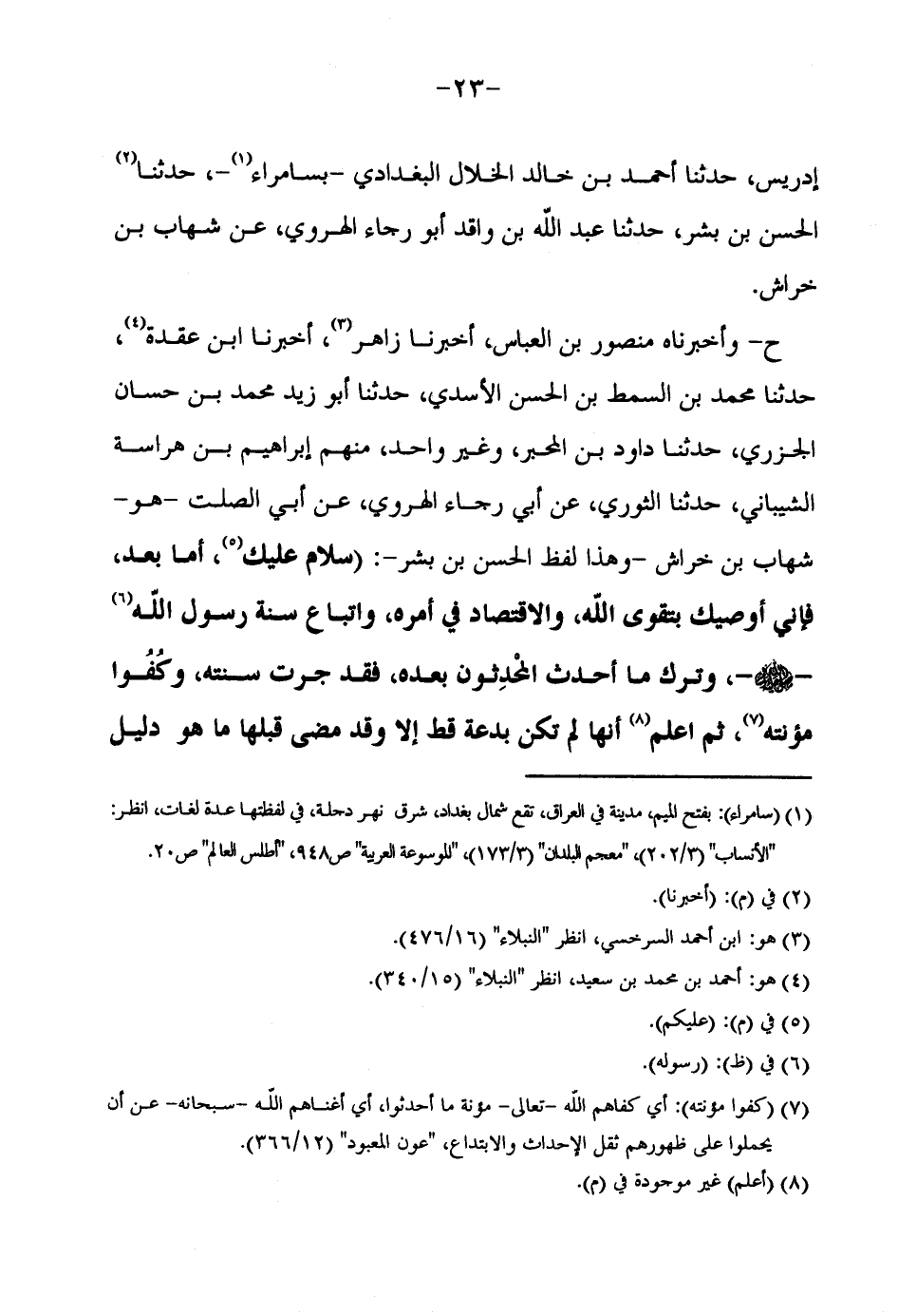 ح وَأَخْبَرَنَاهُ مَنْصُورُ بْنُ الْعَبَّاسِ أَخْبَرَنَا زَاهِرٌ أَخْبَرَنَا ابْنُ عُقْدَةَ حَدَّثَنَا مُحَمَّدُ بْنُ السَّمْطِ بْنِ الْحَسَنِ الْأَسْدِيُّ حَدَّثَنَا أَبُو زَيْدِ مُحَمَّدُ بْنُ حَسَّانٍ الْجَزَرِيُّ حَدَّثَنَا دَاوُدُ بْنُ الْمُحْبَرِ وَغَيْرُ وَاحِدٍ مِنْهُم إِبْرَاهِيم بن هراسة الشَّيْبَانِيّ حَدَّثَنَا الثَّوْرِيُّ عَنْ أَبِي رَجَاءٍ الْهَرَوِيِّ عَنْ أَبِي الصَّلْتِ هُوَ شِهَابُ بن خرَاش وَهَذَا لفظ الْحسن بن بشر (سَلَامٌ عَلَيْكَ أَمَّا بَعْدُ فَإِنِّي أُوصِيكَ بِتَقْوَى اللَّهِ وَالِاقْتِصَادِ فِي أَمْرِهِ وَاتِّبَاعِ سُنَّةِ رَسُولِ اللَّهِ صَلَّى اللَّهُ عَلَيْهِ وَسَلَّمَ وَتَرْكِ مَا أَحْدَثَ الْمُحْدِثُونَ بَعْدَهُ فَقَدْ جَرَتْ سُنَّتُهُ وَكُفُوا مَؤُنَتَهُ ثُمَّ اعْلَمْ أَنَّهَا لَمْ تَكُنْ بِدْعَةٌ قَطُّ إِلَّا وَقَدْ مَضَي قَبْلَهَا ماهو دَلِيلٌ
