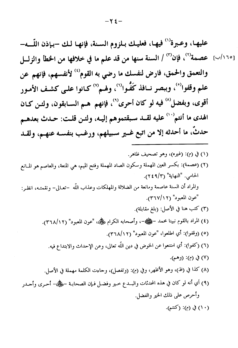 عَلَيْهَا وَعِبْرَةٌ فِيهَا فَعَلَيْكَ بِلُزُومِ السُّنَّةِ فَإِنَّهَا لَكَ بِإِذْنِ اللَّهِ عِصْمَةٌ فَإِنَّ السُّنَّةَ سَنَّهَا مَنْ قَدْ عَلِمَ مَا فِي خِلَافِهَا مِنَ الْخَطَأِ وَالزَّلَلِ وَالتَّعَمُّقِ وَالْحَمَقِ فَارْضَ لِنَفْسِكَ مَا رَضِيَ بِهِ الْقَوْمُ لِأَنْفُسِهِمْ فَإِنَّهُمْ عَنْ عِلْمٍ وَقَفُوا وَبِبَصَرٍ نَافِذِ كَفُّوا وَلَهُمْ كَانُوا عَلَى كَشْفِ الْأُمُورِ أَقْوَى وبفضل فِيهِ لوكان أَحْرَى فَإِنَّهُمْ هُمُ السَّابِقُونَ وَلَئُنْ كَانَ الْهُدَى مَا أَنْتُمْ عَلَيْهِ لَقَدْ سَبَقْتُمُوهُمْ إِلَيْهِ وَلَئِنْ قُلْتُ حَدَثَ بَعْدَهُمْ حَدَثٌ مَا أَحْدَثَهُ إِلَّا مَنِ اتَّبَعَ غَيْرَ سَبِيلِهِمْ وَرَغِبَ بِنَفْسِهِ عَنْهُمْ وَلَقَدْ