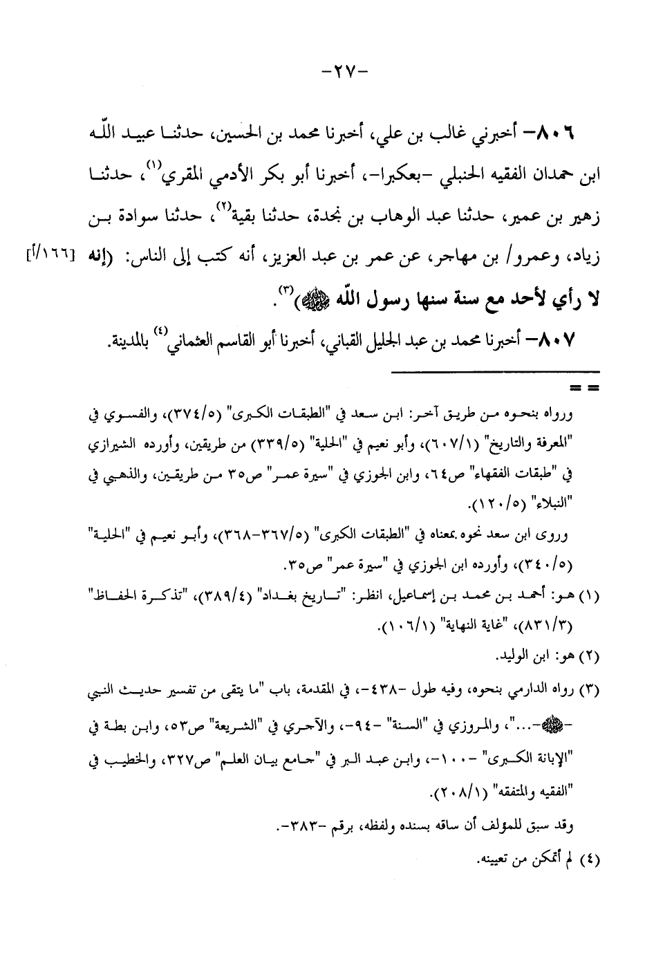 806 - أَخْبَرَنِي غَالِبُ بْنُ عَلِيٍّ أَخْبَرَنَا مُحَمَّدُ بْنُ الْحُسَيْنِ حَدَّثَنَا عُبَيْدُ الله ابْن حِمْدَانَ الْفَقِيهُ الْحَنْبَلِيُّ بِعُكْبَرَا أَخْبَرَنَا أَبُو بَكْرٍ الْأَدَمِيُّ الْمَقَرِّيُّ حَدَّثَنَا زُهَيْرُ بْنُ عُمَيْرٍ حَدَّثَنَا عَبْدُ الْوَهَّابِ بْنُ نَجْدَةَ حَدَّثَنَا بَقِيَّةُ حَّدَثَنَا سِوَادَةُ بْنُ زِيَادٍ وَعَمْرُو بْنُ مُهَاجِرٍ عَنْ عُمَرَ بْنِ عَبْدِ الْعَزِيزِ أَنَّهُ كَتَبَ إِلَى النَّاسِ (إِنَّهُ لَا رَأْيَ لِأَحَدٍ مَعَ سُنَّةٍ سنَهَا رَسُولُ اللَّهِ صَلَّى اللَّهُ عَلَيْهِ وَسَلَّمَ)