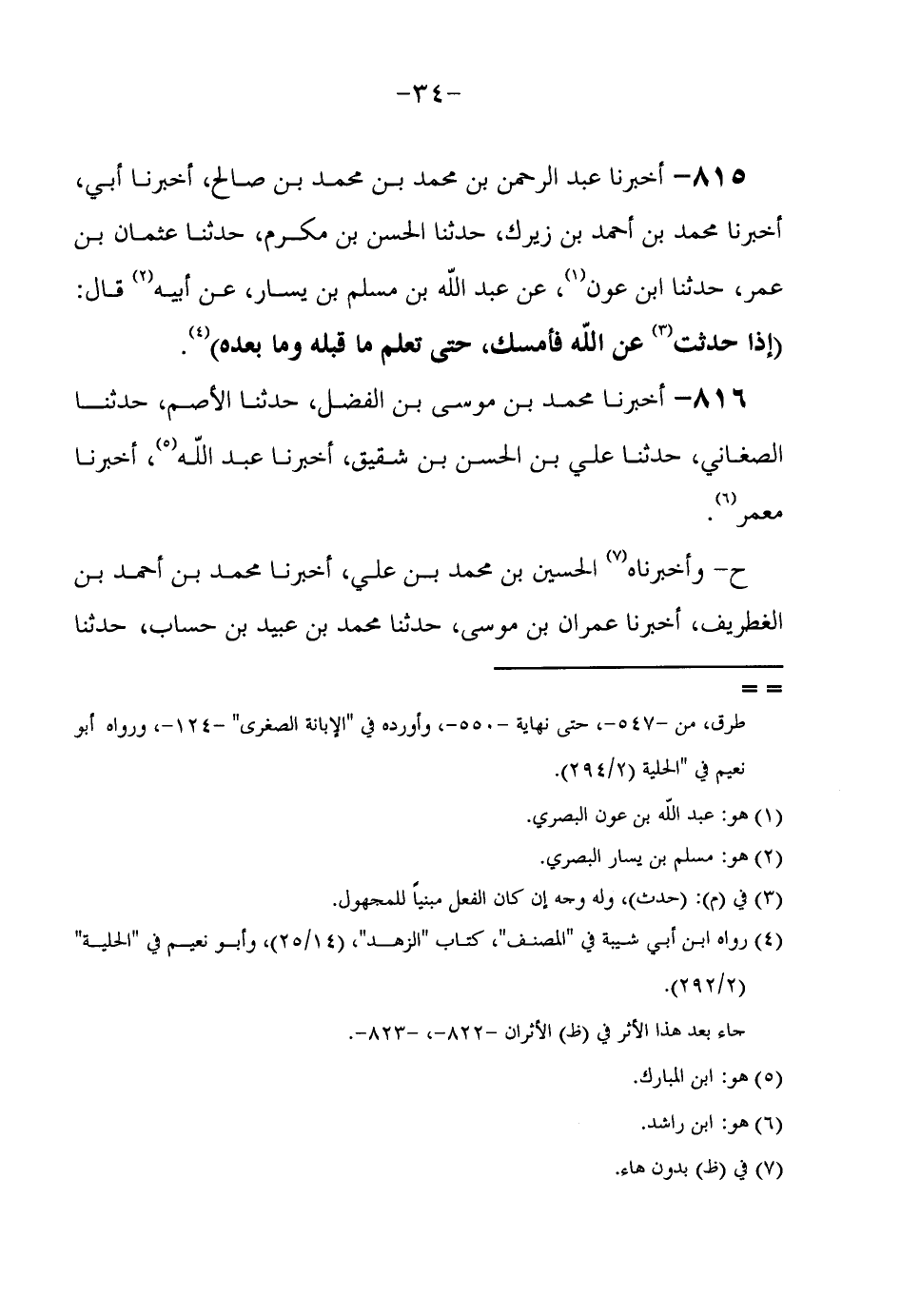 815 - أَخْبَرَنَا عَبْدُ الرَّحْمَنِ بْنُ مُحَمَّدِ بْنِ مُحَمَّدِ بْنِ صَالِحٍ أَخْبَرَنَا أَبِي أَخْبَرَنَا مُحَمَّدُ بْنُ أَحْمَدَ بْنِ زَيْرَكٍ حَدَّثَنَا الْحَسَنُ بْنُ مُكْرِمٍ حدَّثَنَا عُثْمَانُ بْنُ عُمَرَ حَدَّثَنَا ابْنُ عَوْنٍ عَنْ عَبْدِ اللَّهِ بْنِ مُسْلِمِ بْنِ يَسَارٍ عَنْ أَبِيهِ قَالَ (إِذَا حَدَّثْتَ عَنِ اللَّهِ فَأَمْسِكْ حتَّى تَعْلَمَ مَا قَبْلَهُ وَمَا بَعْدَهُ)