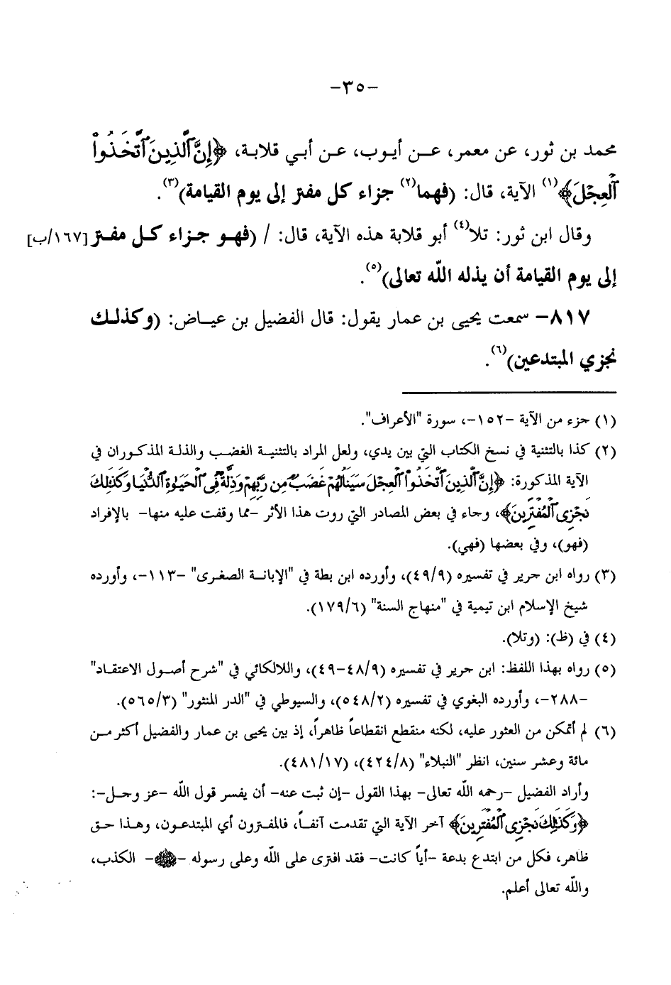 817 - سَمِعْتُ يَحْيَى بْنُ عَمَّارٍ يَقُولُ قَالَ الْفُضَيْلُ بْنُ عَيَّاضٍ (وَكَذَلِكَ نُجْزِي الْمُبْتَدِعِينَ)