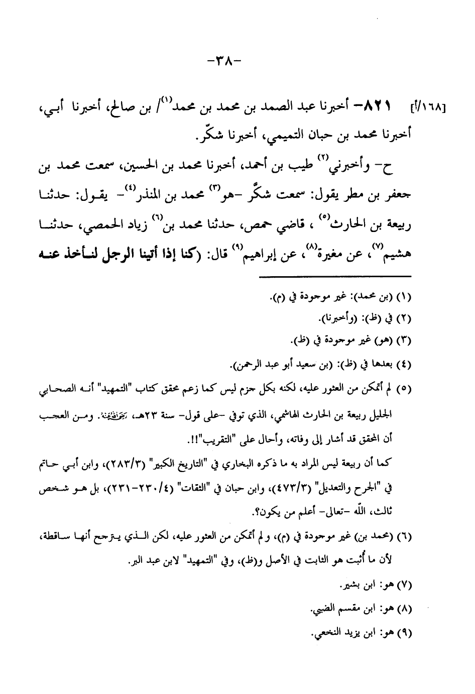 ح وَأَخْبَرَنِي طَيِّبُ بْنُ أَحْمَدَ أَخْبَرَنَا مُحَمَّدُ بْنُ الْحُسَيْنِ سَمِعْتُ مُحَمَّدَ بْنَ جَعْفَرِ بْنِ مَطَرٍ يَقُولُ سَمِعْتُ شَكَّرَ هُوَ مُحَمَّدُ بْنُ الْمُنْذِرِ يَقُولُ حَدَّثَنَا رَبِيعَةُ بْنُ الْحَارِثِ قَاضِي حِمْصٍ حَدَّثَنَا مُحَمَّدُ بْنُ زِيَادٍ الْحِمْصِيُّ حَدَّثَنَا هُشَيْمٌ عَنْ مُغِيرَةَ عَنْ إِبْرَاهِيمَ قَالَ (كُنَّا إِذَا أَتَيْنَا الرَّجُلَ لِنَأَْخُذَ عَنْهُ