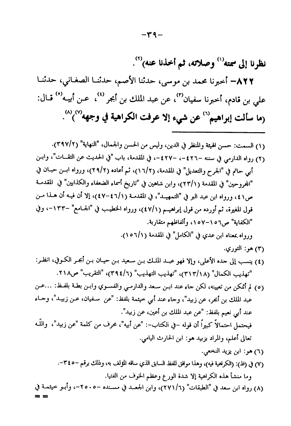 822 - أَخْبَرَنَا مُحَمَّدُ بْنُ مُوسَى حَدَّثَنَا الَأصَمُّ حَدَّثَنَا الصَّغَانِيُّ حَدَّثَنَا عَلِيُّ بْنُ قَادِمٍ أَخْبَرَنَا سُفْيَانُ عَنْ عَبْدِ الْمَلِكِ بْنِ أَبْجَرَ عَنْ أَبِيهِ قَالَ (مَا سَأَلْتُ إِبْرَاهِيمَ عَنْ شَيْءٍ إِلَّا عَرِفْتُ الْكَرَاهِيَةَ فِي وَجْهِهِ)