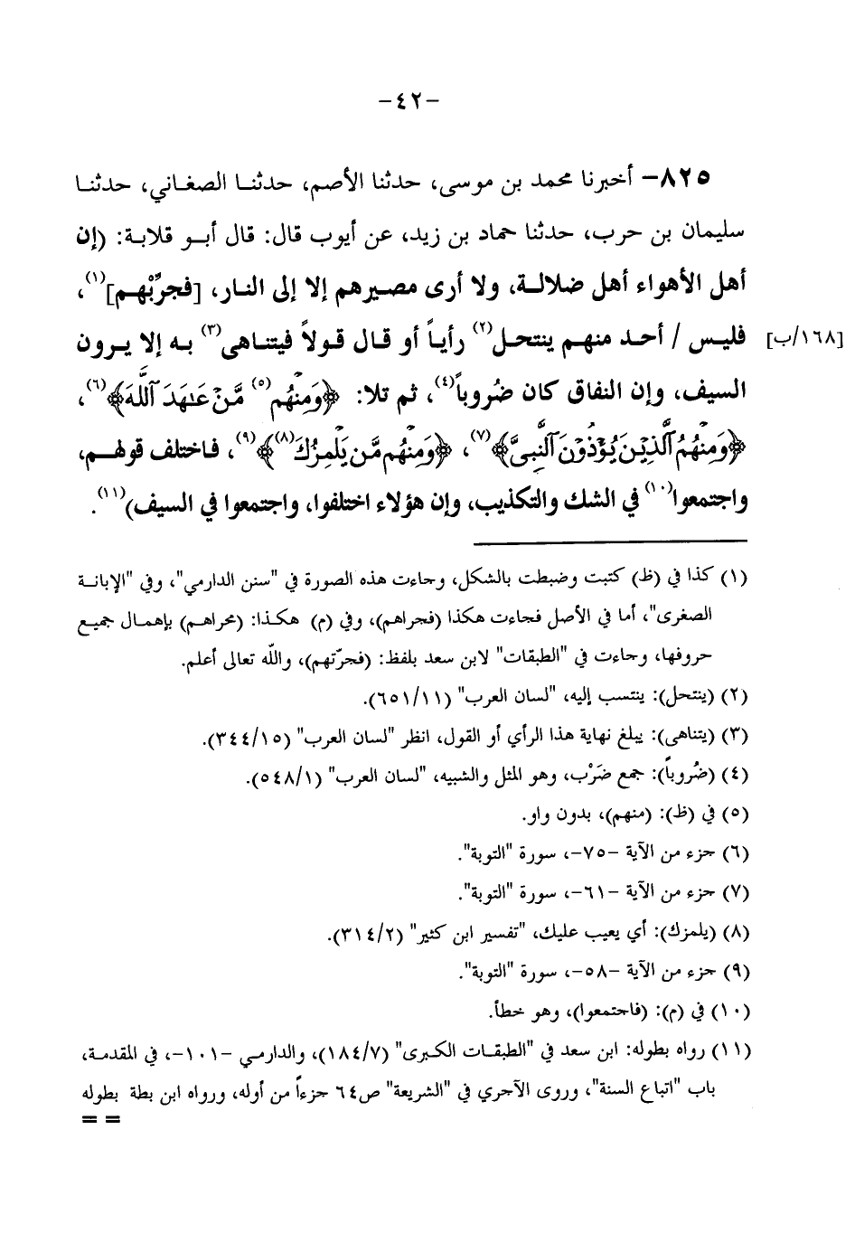 825 - أَخْبَرَنَا مُحَمَّدُ بْنُ مُوسَى حَدَّثَنَا الْأَصَمُّ حَدَّثَنَا الصَّغَانِيُّ حَدَّثَنَا سُلَيْمَانُ بْنُ حَرْبٍ حَدَّثَنَا حَمَّادُ بْنُ زَيْدٍ عَنْ أَيُّوبَ قَالَ قَالَ أَبُو قِلَابَةَ إِنَّ أَهْلَ الْأَهْوَاءِ أهل ضَلَالَة ولاأرى مَصِيرَهُمْ إِلَّا إِلَى النَّارِ فَجَرِّبْهُمْ فَلَيْسَ أَحَدٌ مِنْهُمْ يَنْتَحِلُ رَأْيًا أَوْ قَالَ قَوْلًا فَيَتَنَاهَى بِهِ إِلَّا يَرَوْنَ السَّيْفَ وَإِنَّ النِّفَاقَ كَانَ ضُرُوبًا ثُمَّ تَلَا {وَمِنْهُمْ من عَاهَدَ الله} {وَمِنْهُم الَّذين يُؤْذونَ النَّبِي} {وَمِنْهُم من يَلْمِزك} فَاخْتَلَفَ قَوْلُهُمْ وَاجْتَمَعُوا فِي الشَّكِّ وَالتَّكْذِيبِ وَإِنَّ هَؤُلَاءِ اخْتَلَفُوا وَاجْتَمَعُوا فِي السَّيْفِ