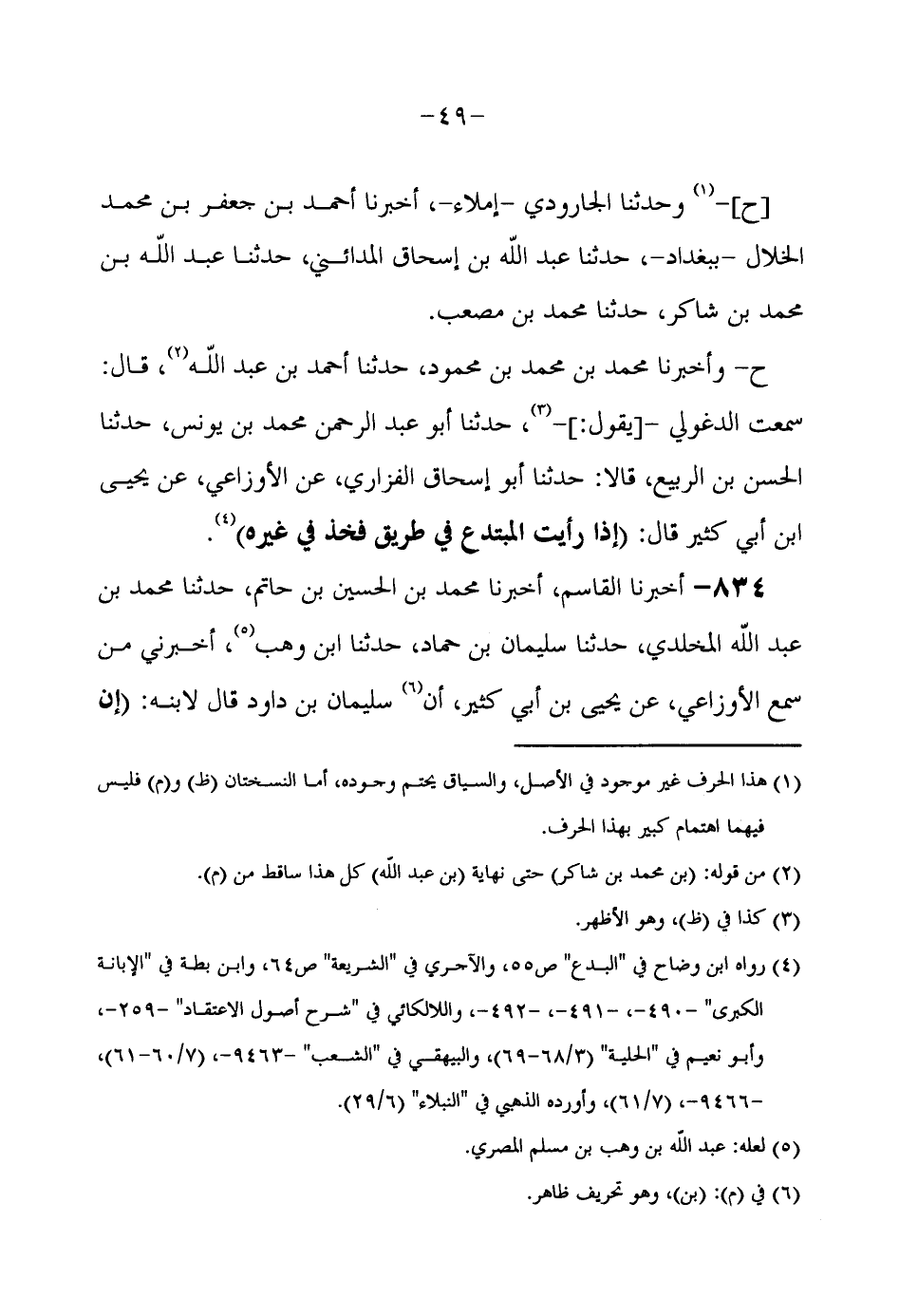 ح وَأَخْبَرَنَا مُحَمَّدُ بْنُ مُحَمَّدِ بْنِ مَحْمُودٍ حَدَّثَنَا أَحْمَدُ بْنُ عَبْدِ اللَّهِ قَالَ سَمِعْتُ الدَّغُولِيَّ يَقُولُ حَدَّثَنَا أَبُو عَبْدِ الرَّحْمَنِ مُحَمَّدُ بْنُ يُونُسَ حَدَّثَنَا الْحَسَنُ بْنُ الرَّبِيعِ قَالَا حَدَّثَنَا أَبُو إِسْحَاقَ الْفَزَّارِيُّ عَن الْأَوْزَاعِيّ عَن يحيى ابْن أَبِي كَثِيرٍ قَالَ (إِذَا رَأَيْتَ الْمُبْتَدِعَ فِي طَرِيقٍ فَخُذْ فِي غَيْرِهِ)