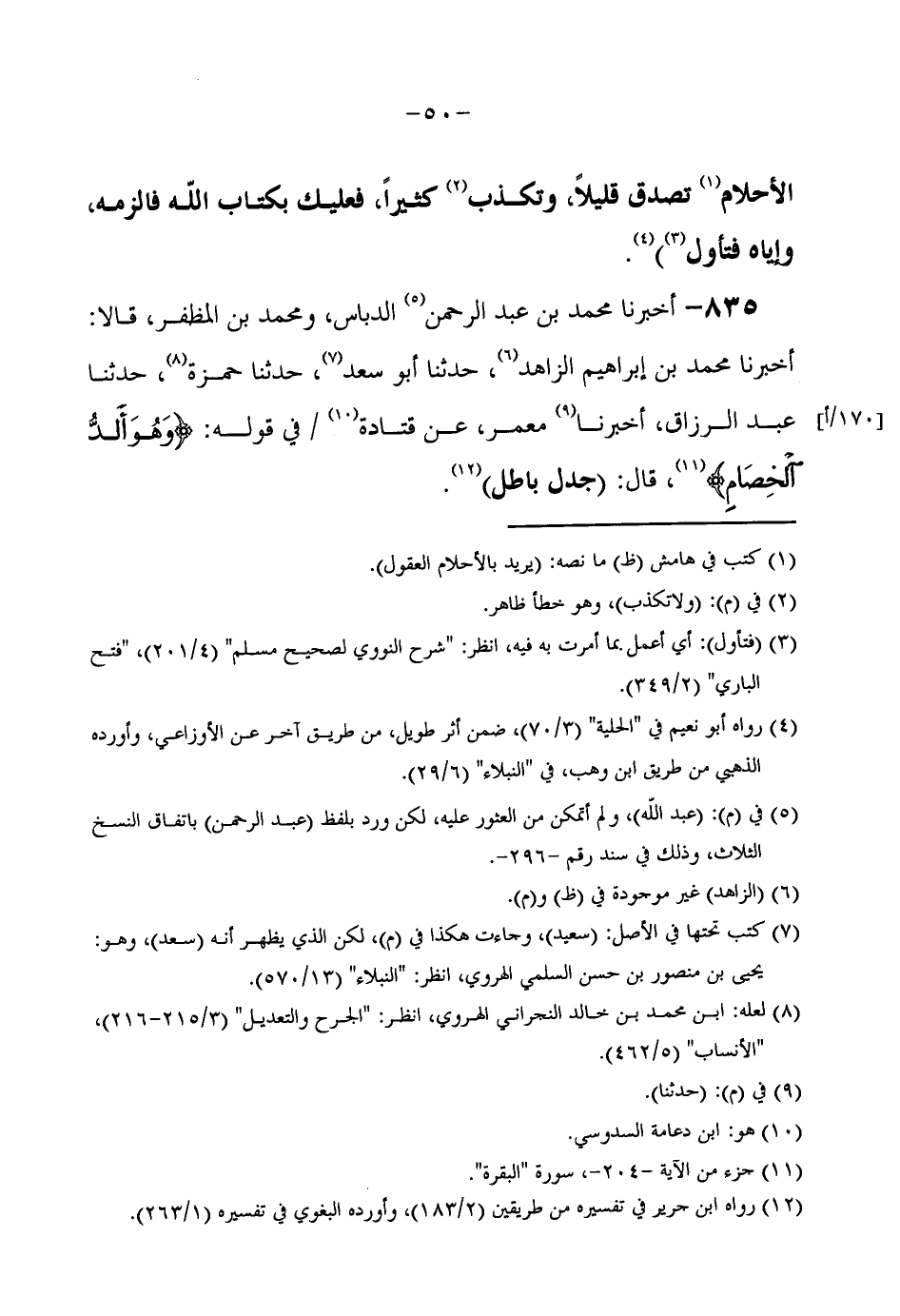 835 - أَخْبَرَنَا مُحَمَّدُ بْنُ عَبْدِ الرَّحْمَن والدباس وَمُحَمَّدُ بْنُ الْمُظَفَّرِ قَالَا أَخْبَرَنَا مُحَمَّدُ بْنُ إِبْرَاهِيمَ الزَّاهِدُ حَدَّثَنَا أَبُو سَعْدٍ حَدَّثَنَا حَمْزَةُ حَدَّثَنَا عَبْدُ الرَّزَّاقِ أَخْبَرَنَا مَعْمَرٌ عَنْ قَتَادَةَ فِي قَوْلِهِ {وَهُوَ أَلَدُّ الْخِصَام} قَالَ (جَدَلٌ بَاطِلٌ)