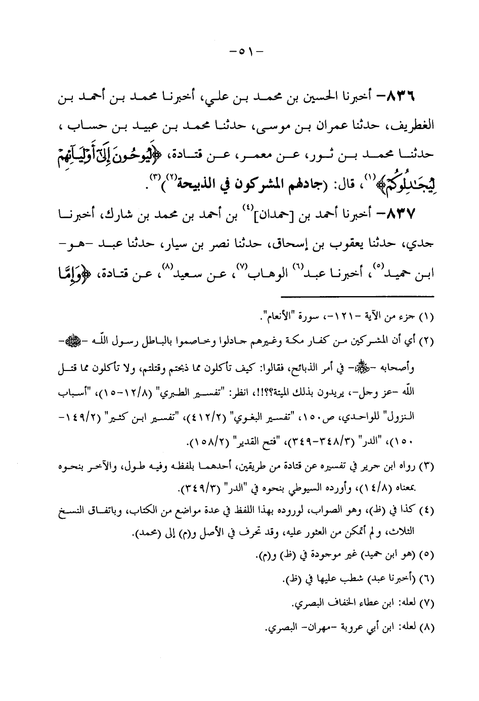 836 - أَخْبَرَنَا الْحُسَيْنُ بْنُ مُحَمَّدِ بْنِ عَلِيٍّ أَخْبَرَنَا مُحَمَّدُ بْنُ أَحْمَدَ بْنِ الْغَطْرِيفِ حَدَّثَنَا عِمْرَانُ بْنُ مُوسَى حَدَّثَنَا مُحَمَّدُ بْنُ عُبَيْدِ بْنِ حَسَّابٍ حَدَّثَنَا مُحَمَّدُ بْنُ ثَوْرٍ عَنْ مَعْمَرٍ عَنْ قَتَادَةَ {ليوحون إِلَى أَوْلِيَائِهِمْ ليجادلوكم} قَالَ (جادلهم الْمُشْرِكُونَ فِي الذَّبِيحَةِ)