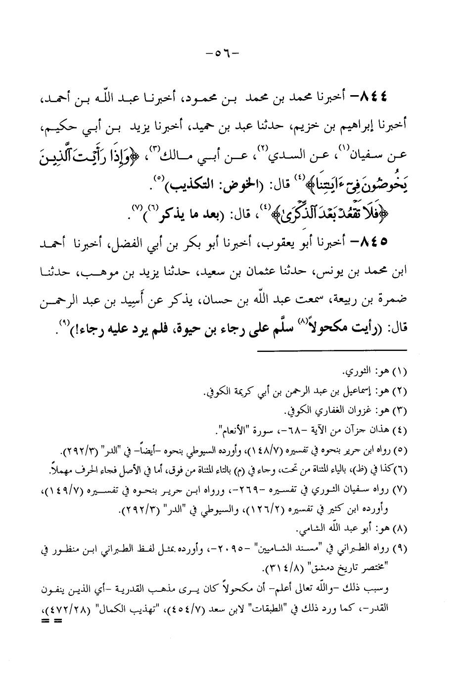 844 - أَخْبَرَنَا مُحَمَّدُ بْنُ مُحَمَّدِ بْنِ مَحْمُودٍ أَخْبَرَنَا عَبْدُ اللَّهِ بْنُ أَحْمَدَ أَخْبَرَنَا إِبْرَاهِيمُ بْنُ خُزَيْمٍ حَدَّثَنَا عَبْدُ بْنُ حُمَيْدٍ أَخْبَرَنَا يَزِيدُ بْنُ أَبِي حَكِيمٍ عَنْ سُفْيَانَ عَنِ السَّدِيِّ عَنْ أَبِي مَالِكٍ {وَإِذَا رَأَيْتَ الَّذِينَ يَخُوضُونَ فِي آيَاتنَا} قَالَ (الْخَوْضُ التَّكْذِيبُ)