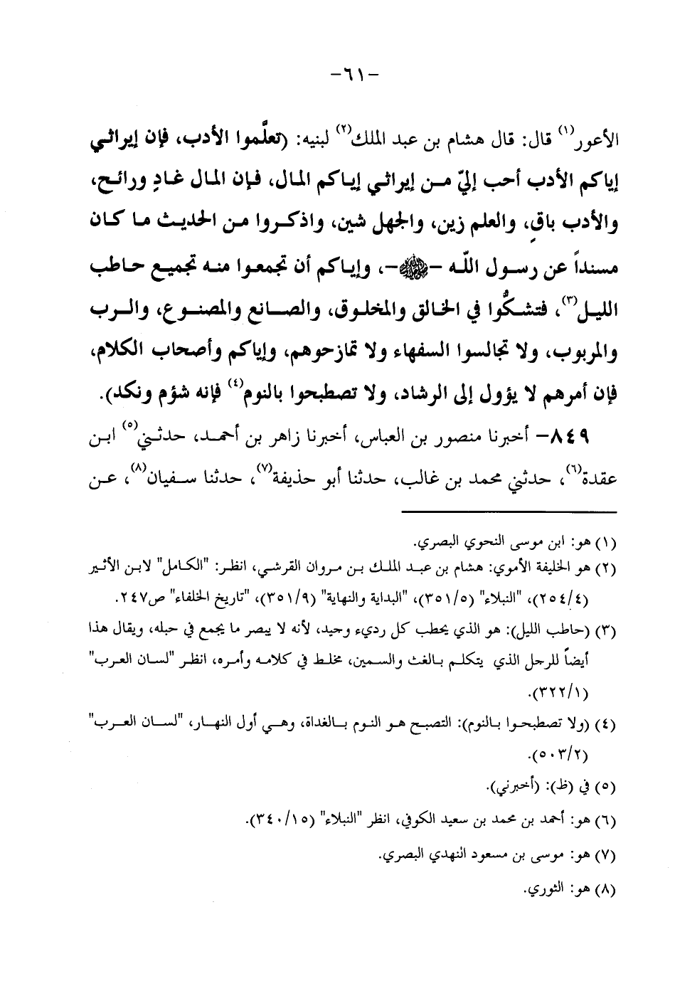 الْأَعْوَرُ قَالَ قَالَ هِشَامُ بْنُ عَبْدِ الْمَلِكِ لِبَنِيهِ (تَعَلَّمُوا الْأَدَبَ فَإِنَّ إِيرَاثِي إِيَّاكُمُ الْأَدَبَ أَحَبُّ إِلَيَّ مِنْ إِيرَاثِي إِيَّاكُمُ الْمَالَ فَإِنَّ الْمَالَ غَادٍ وَرَائِحٌ وَالْأَدَبَ بَاقٍ وَالْعِلْمَ زَيْنٌ وَالْجَهْلَ شَيْنٌ وَاذْكُرُوا مِنَ الْحَدِيثِ مَا كَانَ مُسْنَدًا عَنْ رَسُولِ اللَّهِ صَلَّى اللَّهُ عَلَيْهِ وَسَلَّمَ وَإِيَّاكُمْ أَنْ تُجَمِّعُوا مِنْهُ تَجْمِيعَ حَاطِبِ اللَّيْلِ فَتَشُكُّوا فِي الْخَالِقِ وَالْمَخْلُوقِ وَالصَّانِعِ وَالمَصْنُوعِ وَالرَّبِّ وَالْمَرْبُوبِ وَلَا تُجَالِسُوا السُّفَهَاءَ وَلَا تُمَازِحُوهُمْ وَإِيَّاكُمْ وَأَصْحَابَ الْكَلَام فَإِن أَمرهم لَا يؤول إِلَى الرَّشَادِ وَلَا تَصْطَبِحُوا بِالنَّوْمِ فَإِنَّهُ شُؤْمٌ وَنَكَدٌ)