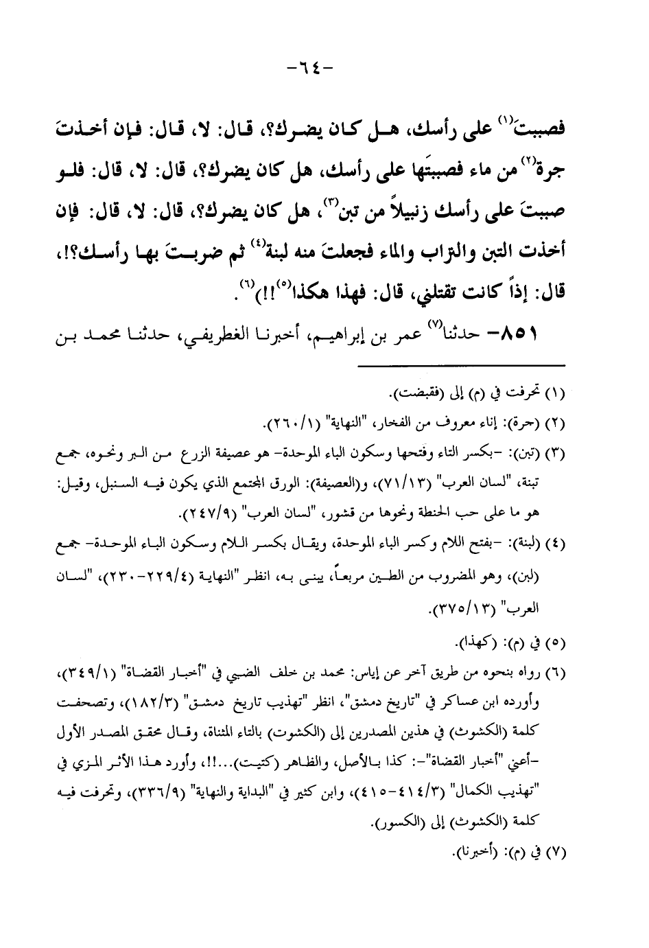 فَصَبَبْتَ عَلَى رَأْسِكَ هَلْ كَانَ يَضُرُّكَ قَالَ لَا قَالَ فَإِنْ أَخَذْتَ جَرَّةً مِنْ مَاءٍ فَصَبَبْتَهَا عَلَى رَأْسِكَ هَلْ كَانَ يَضُرُّكَ قَالَ لَا قَالَ فَلَوْ صَبَبْتَ عَلَى رَأْسِكَ زِنْبِيلًا مِنْ تِبْنٍ هَلْ كَانَ يَضُرُّكَ قَالَ لَا قَالَ فَإِنْ أَخَذْتَ التِّبْنَ وَالتُّرَابَ وَالْمَاءَ فَجَعَلْتَ مِنْهُ لَبِنَةً ثُمَّ ضَرَبْتَ بِهَا رَأْسَكَ قَالَ إِذًا كَانَتْ تَقْتُلُنِي قَالَ فَهَذَا هَكَذَا)