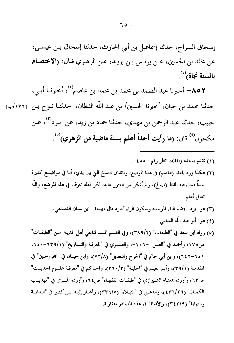 إِسْحَاقَ السَّرَّاجُ حَدَّثَنَا إِسْمَاعِيلُ بْنُ أَبِي الْحَارِثِ حَدَّثَنَا إِسْحَاقُ بْنُ عِيسَى عَنْ مَخْلَدِ بْنِ الْحُسْيَنِ عَنْ يُونُسَ بْنِ يَزِيدَ عَنِ الزُّهْرِيِّ قَالَ (الِاعْتِصَامُ بِالسُّنَّةِ نَجَاةٌ)