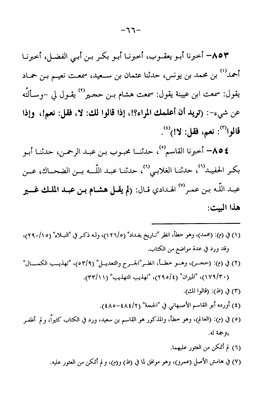 854 - أَخْبَرَنَا الْقَاسِمُ حَدَّثَنَا مَحْبُوبُ بْنُ عَبْدِ الرَّحْمَنِ حَدَّثَنَا أَبُو بَكْرٍ الْحَفِيدُ حَدَّثَنَا الْغَلَّابِيُّ حَدَّثَنَا عَبْدُ اللَّهِ بْنُ الضَّحَّاكِ عَنْ عَبْدِ اللَّهِ بْنِ عُمَرَ الْهُدَادِيِّ قَالَ (لَمْ يَقُلْ هِشَامُ بْنُ عَبْدِ الْمَلِكِ غَيْرَ هَذَا الْبَيْتِ