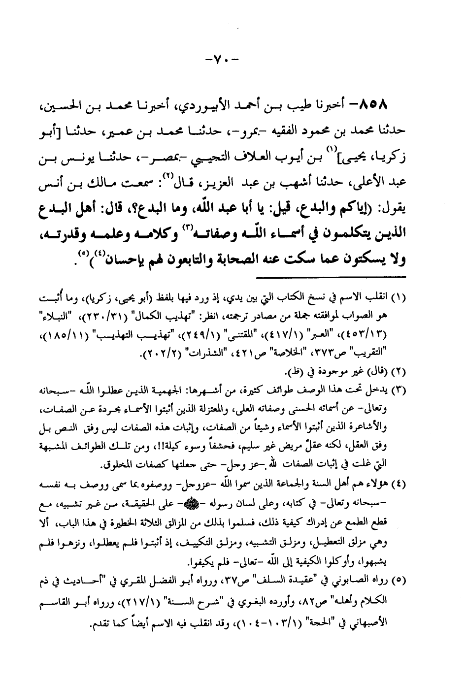 858 - أَخْبَرَنَا طَيِّبُ بْنُ أَحْمَدَ الْأَبْيُورَدِيُّ أَخْبَرَنَا مُحَمَّدُ بْنُ الْحُسَيْنِ حَدَّثَنَا مُحَمَّدُ بْنُ مَحْمُودٍ الْفَقِيهُ بِمِرْوَ حَدَّثَنَا مُحَمَّدُ بْنُ عُمَيْرٍ حَدَّثَنَا أَبُو زَكَرِيَا يَحْيَى بْنُ أَيُّوبَ الْعَلَّافُ التَّجِيبِيُّ بِمِصْرَ حَدَّثَنَا يُونُسُ بْنُ عَبْدِ الْأَعْلَى حَدَّثَنَا أَشْهَبُ بْنُ عَبْدِ الْعَزِيزِ قَالَ سَمِعْتُ مَالِكَ بْنَ أَنَسٍ يَقُولُ (إِيَّاكُمْ وَالْبِدَعَ قِيلَ يَا أَبَا عَبْدِ اللَّهِ وَمَا الْبِدَعُ قَالَ أَهْلُ الْبِدَعِ الَّذِينَ يَتَكَلَّمُونَ فِي أَسْمَاءِ اللَّهِ وَصِفَاتِهِ وَكَلَامِهِ وَعِلْمِهِ وَقُدْرَتِهِ وَلَا يَسْكُتُونَ عَمَّا سَكَتَ عَنْهُ الصَّحَابَةُ وَالتَّابِعُونَ لَهُمْ بِإِحْسَانٍ)