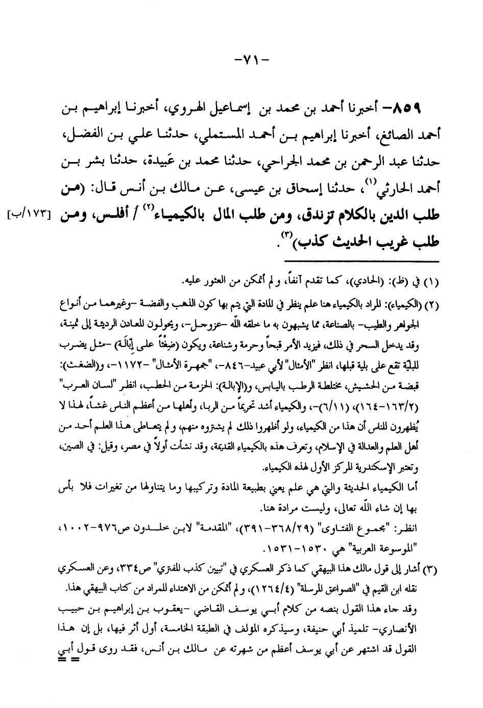859 - أَخْبَرَنا أَحْمَدُ بْنُ مُحَمَّدِ بْنِ إِسْمَاعِيلَ الْهَرَوِيُّ أَخْبَرَنَا إِبْرَاهِيمُ بْنُ أَحْمَدَ الصَّائِغُ أَخْبَرَنَا إِبْرَاهِيمُ بْنُ أَحْمَدَ الْمُسْتَمْلِيُّ حَدَّثَنَا عَلِيُّ بْنُ الْفَضْلِ حَدَّثَنَا عَبْدُ الرَّحْمَنِ بْنُ مُحَمَّدٍ الْجَرَّاحِيُّ حَدَّثَنَا مُحَمَّدُ بْنُ عَبِيدَةَ حَدَّثَنَا بِشْرُ بْنُ أَحْمَدَ الْحَارِثِيُّ حَدَّثَنَا إِسْحَاقُ بْنُ عِيسَى عَنْ مَالِكِ بْنِ أَنَسٍ قَالَ (مَنْ طَلَبَ الدِّينَ بِالْكَلَامِ تَزَنْدَقَ وَمَنْ طَلَبَ الْمَالَ بِالْكِيِمْيَاءِ أَفْلَسَ وَمَنْ طَلَبَ غَرِيبَ الْحَدِيثِ كَذِبَ)