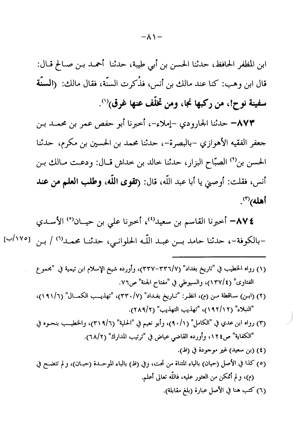 ابْن الْمُظَفَّرِ الْحَافِظُ حَدَّثَنَا الْحَسَنُ بْنُ أَبِي طِيبَةَ حَدَّثَنَا أَحْمَدُ بْنُ صَالِحٍ قَالَ قَالَ ابْنُ وَهْبٍ كَانَ عِنْدَ مَالِكِ بْنِ أَنَسٍ فَذُكِرَتِ السّنة فَقَالَ مَالك (السُّنَّةُ سَفِينَةُ نُوحٍ مَنْ رَكِبَهَا نَجَا وَمَنْ تَخَلَّفَ عَنْهَا غَرِقَ)