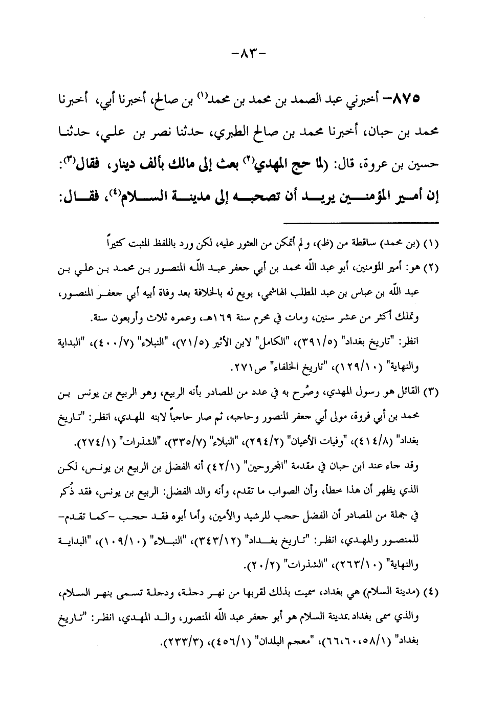 875 - أَخْبَرَنِي عَبْدُ الصَّمَدِ بْنُ مُحَمَّدِ بْنِ مُحَمَّدِ بْنِ صَالِحٍ أَخْبَرَنَا أَبِي أَخْبَرَنَا مُحَمَّدُ بْنُ حَبَّانَ أَخْبَرَنَا مُحَمَّدُ بْنُ صَالِحٍ الطَّبَرِيُّ حَدَّثَنَا نَصْرُ بْنُ عَلِيٍّ حَدَّثَنَا حُسَيْنُ بْنُ عُرْوَةَ قَالَ (لَمَّا حَجَّ الْمَهْدِيُّ بَعَثَ إِلَى مَالِكٍ بِأَلْفِ دِينَارٍ فَقَالَ إِنَّ أَمِيرَ الْمُؤْمِنِينَ يُرِيدُ أَنْ تَصْحَبَهُ إِلَى مَدِينَةِ السَّلَامِ فَقَالَ