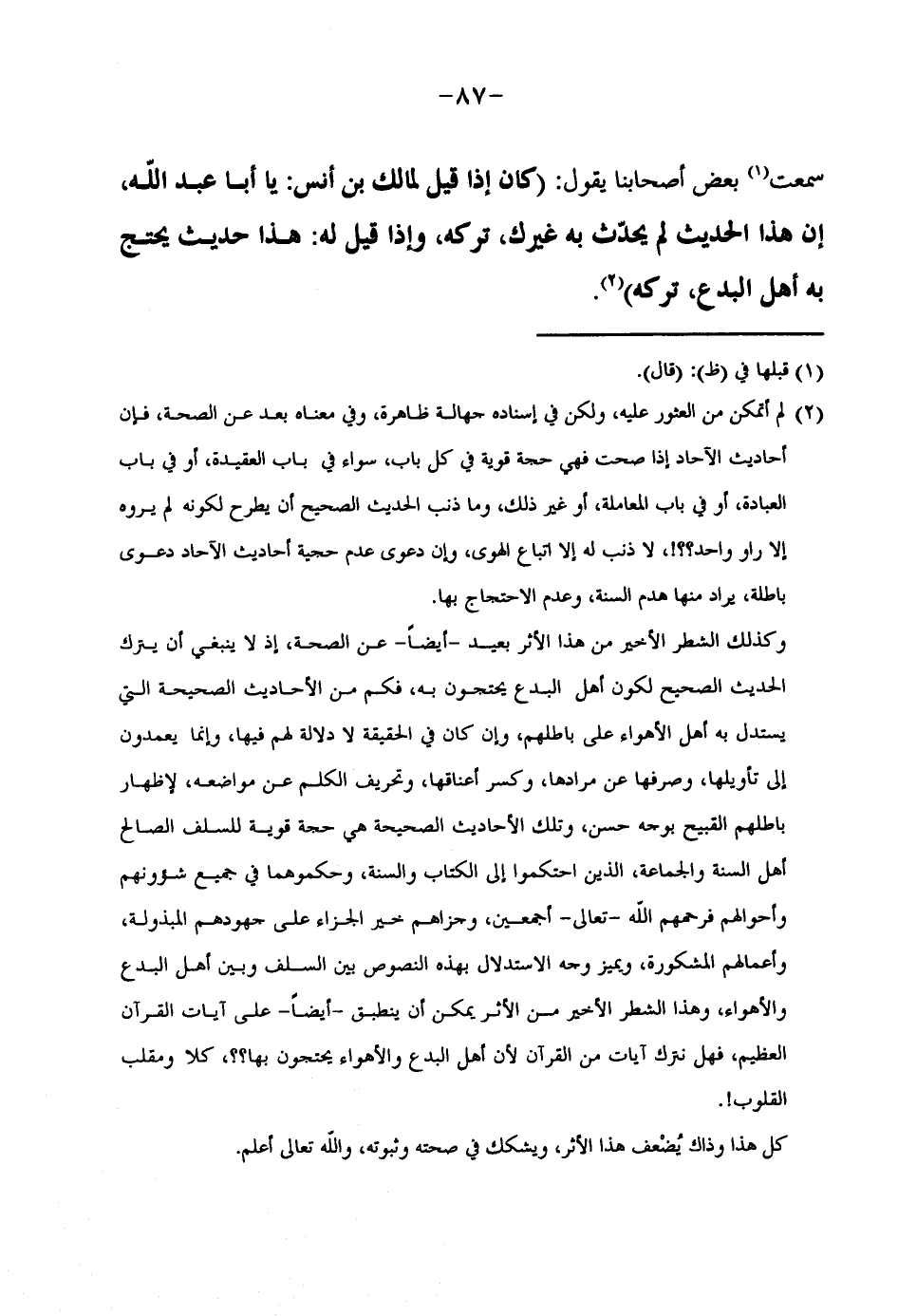 سَمِعْتُ بَعْضَ أَصْحَابِنَا يَقُولُ (كَانَ إِذَا قِيلَ لِمَالِكِ بْنِ أَنَسٍ يَا أَبَا عَبْدِ اللَّهِ إِنَّ هَذَا الْحَدِيثَ لَمْ يُحَدِّثْ بِهِ غَيْرُكَ تَرَكَهُ وَإِذَا قِيلَ لَهُ هَذَا حَدِيثٌ يَحْتَجُ بِهِ أَهْلُ الْبِدَعِ تَرَكَهُ)
