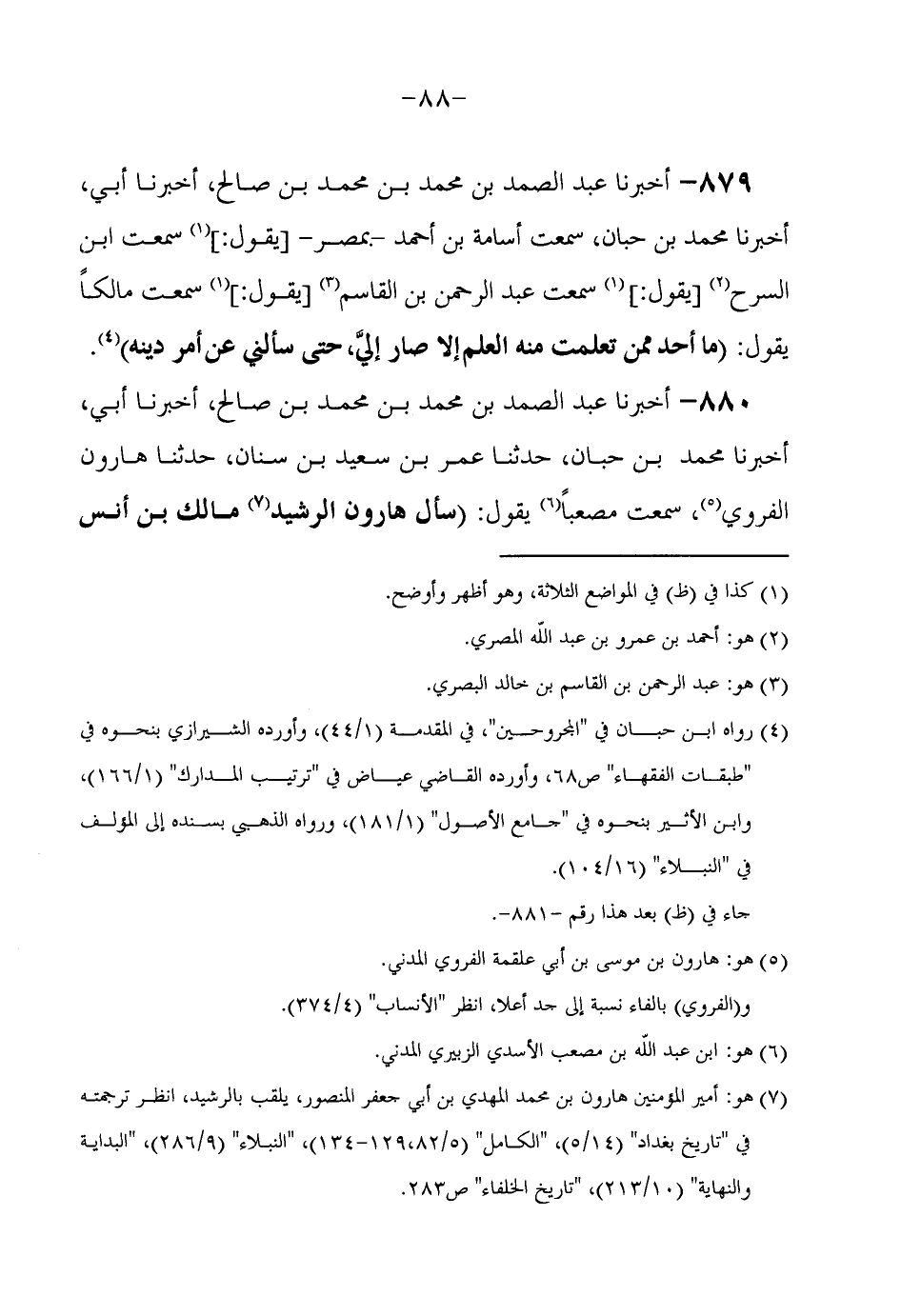 880 - أَخْبَرَنَا عَبْدُ الصَّمَدِ بْنُ مُحَمَّدِ بْنِ مُحَمَّدِ بْنِ صَالِحٍ أَخْبَرَنَا أَبِي أَخْبَرَنَا مُحَمَّدُ بْنُ حَبَّانَ حَدَّثَنَا عُمَرُ بْنُ سَعِيدِ بْنِ سِنَانٍ حَدَّثَنَا هَارُونُ الْفَرَوِيُّ سَمِعْتُ مُصْعَبًا يَقُولُ (سَأَلَ هَارُونُ الرَّشِيدُ مَالِكَ بْنَ أَنَسٍ
