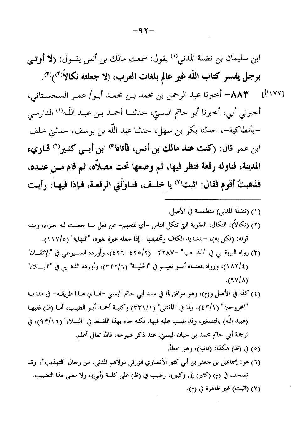 883 - أَخْبَرَنَا عَبْدُ الرَّحْمَنِ بْنَ مُحَمَّدِ بْنِ مُحَمَّدٍ أَبُو عُمَرَ السَّجِسْتَانِيُّ أَخْبَرَنِي أَبِي أَخْبَرَنَا أَبُو حَاتِمٍ الْبَسْتِيُّ حَدَّثَنَا أَحْمَدُ بْنُ عَبْدِ اللَّهِ الدَّارَمِيّ بِأَنْطَاكِيَّةَ حَدَّثَنَا بَكْرُ بْنُ سَهْلٍ حَدَّثَنَا عَبْدُ اللَّهِ بْنُ يُوسُفَ حَدثنِي خلف ابْن عُمَرَ قَالَ (كُنْتُ عِنْدَ مَالِكِ بْنِ أَنَسٍ فَأَتَاهُ ابْنُ أَبِي كثير قاريء الْمَدِينَةِ فَنَاوَلَهُ رُقْعَةً فَنَظَرَ فِيهَا ثُمَّ وَضَعَهَا تَحْتَ مُصَلَّاهُ ثُمَّ قَامَ مِنْ عِنْدَهُ فَذَهَبْتُ أَقُومُ فَقَالَ اثْبُتْ يَا خَلَفُ فَنَاوَلَنِي الرُّقْعَةَ فَإِذَا فِيهَا رَأَيْتُ